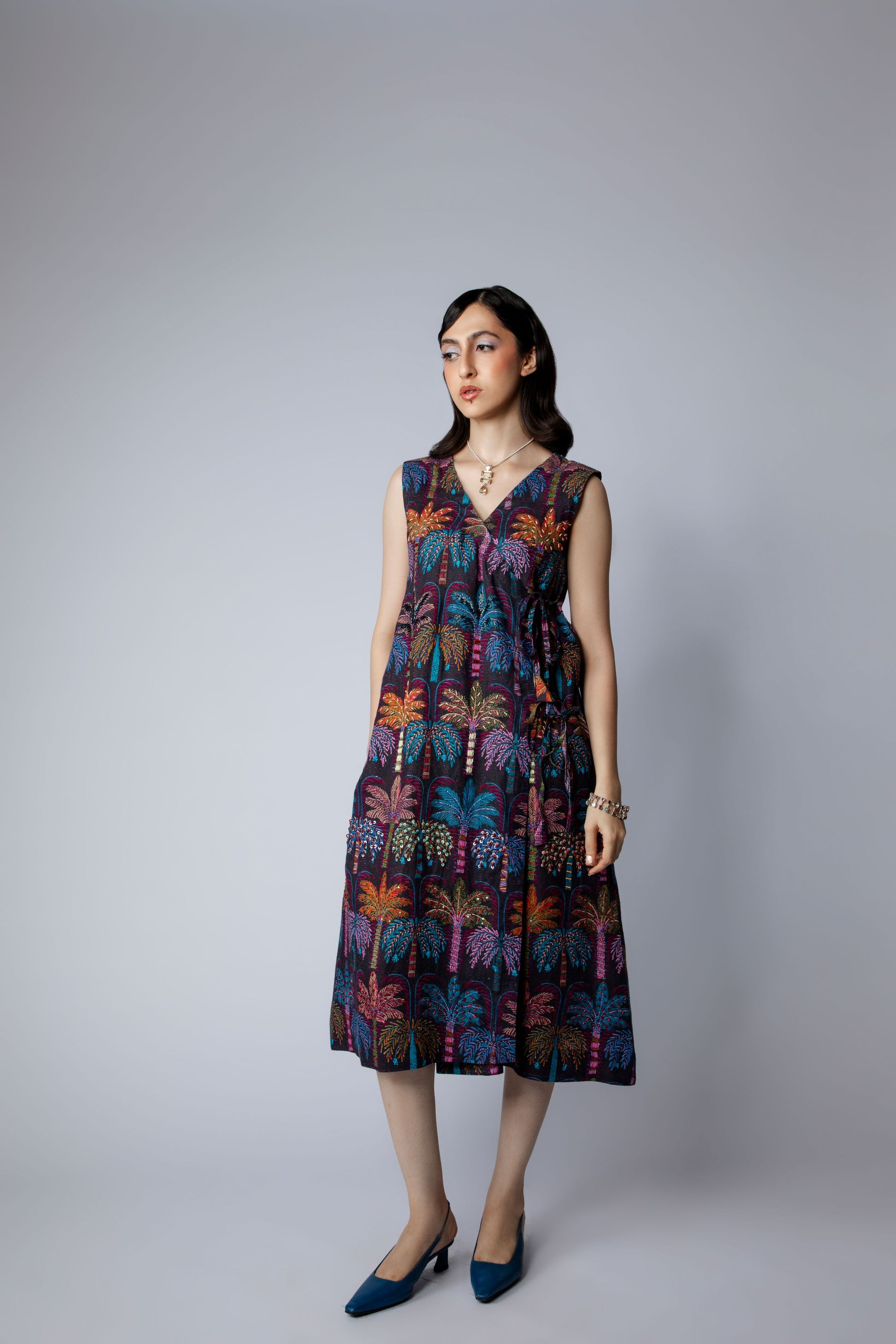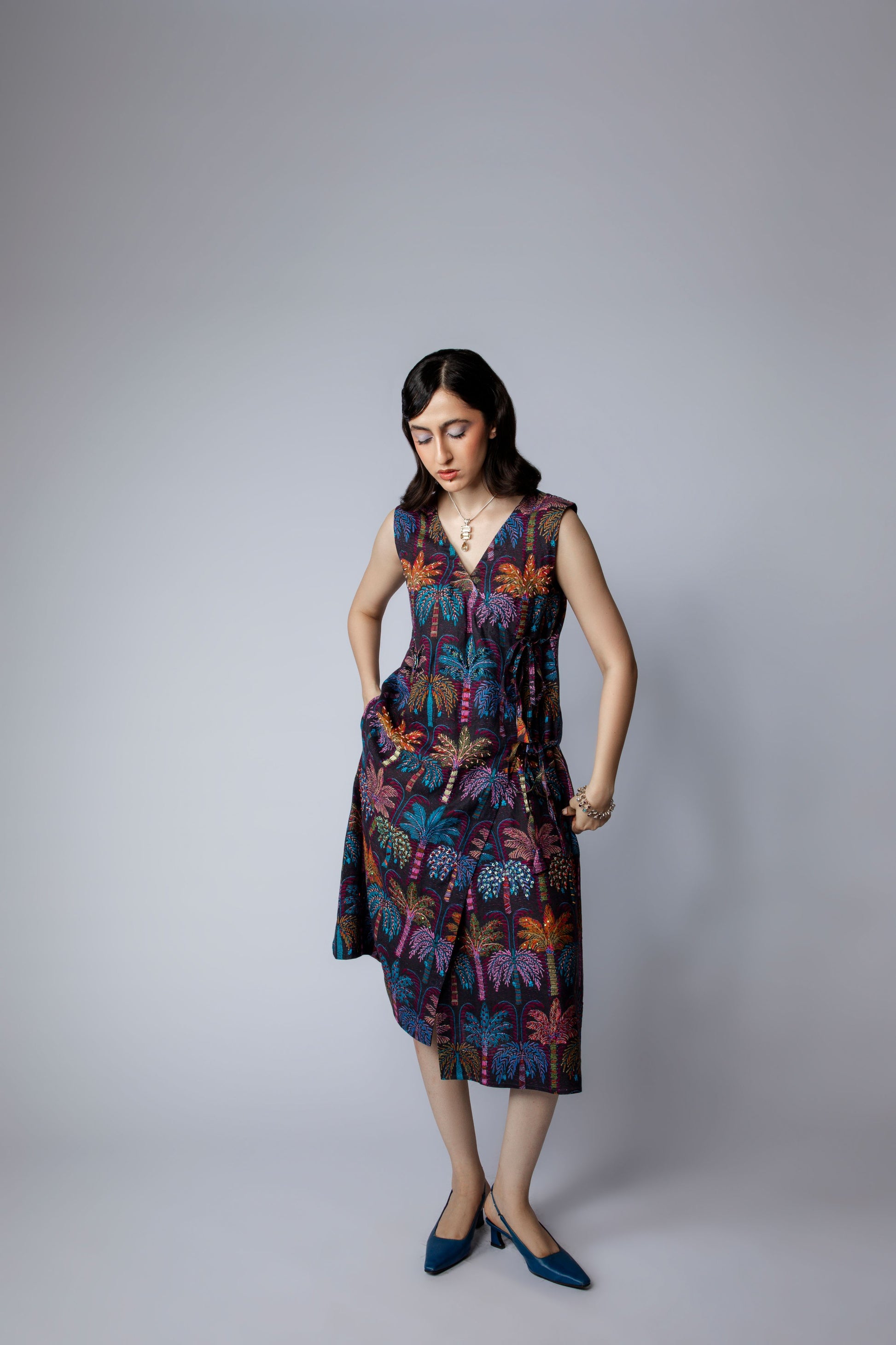 Resort glam meets real-world function. This wrap-style blue midi dress in our signature moody palm print brings effortless elegance to poolside lounging and beachside soirées. With a flattering silhouette and a pocket that actually holds your essentials, it’s as practical as it is pretty. Throw it over your swimsuit or style it with sandals and gold hoops. Either way, you're the main character.