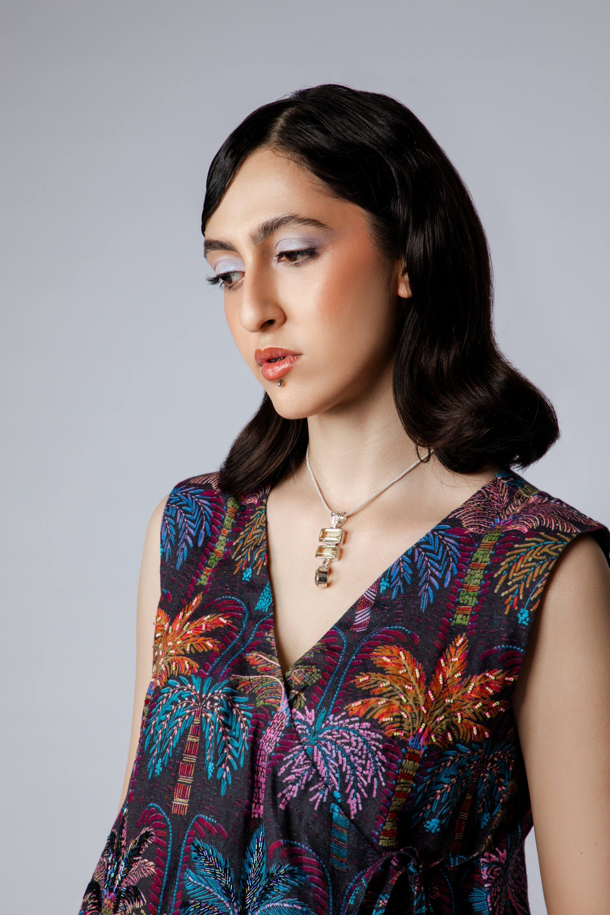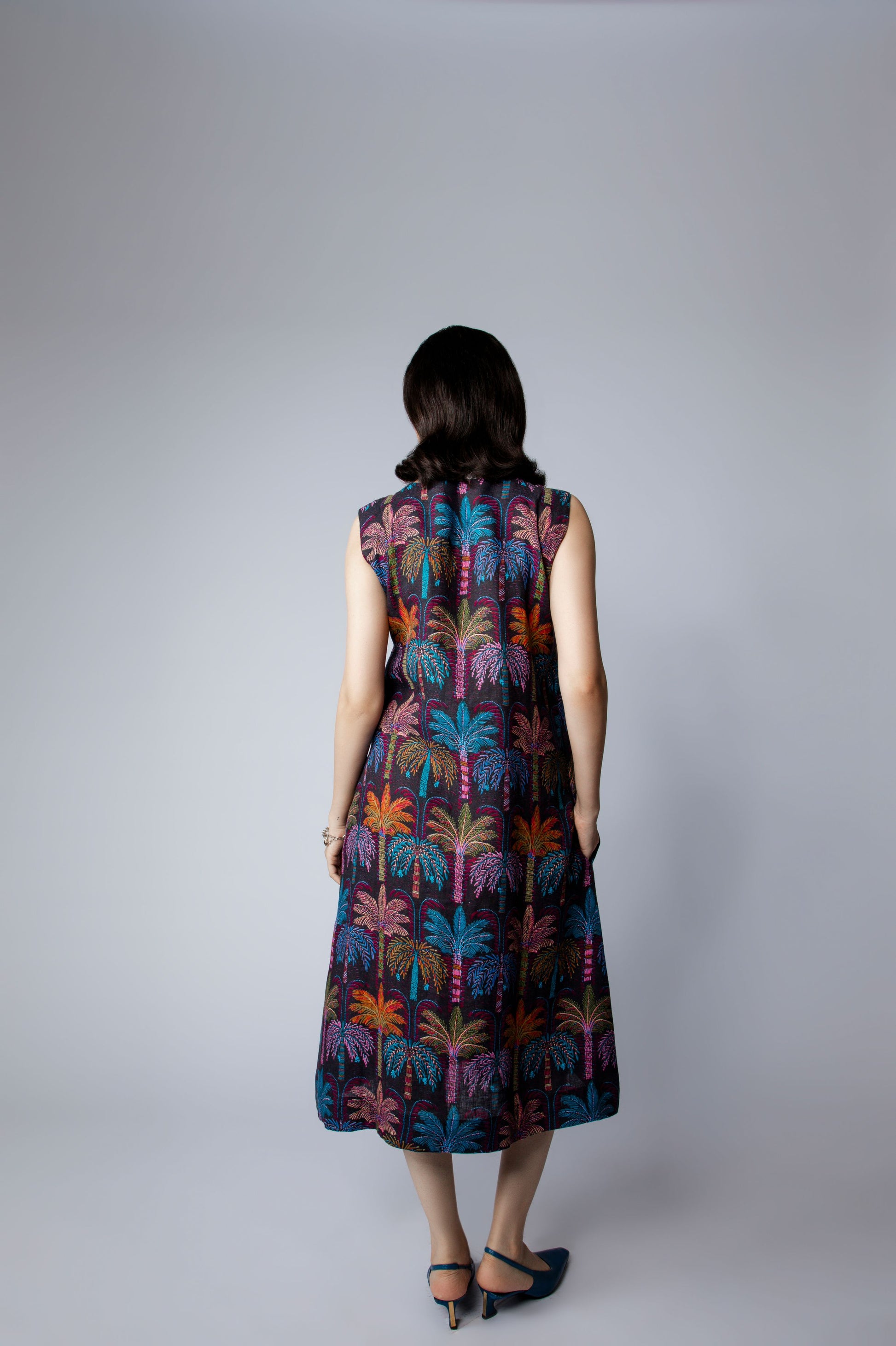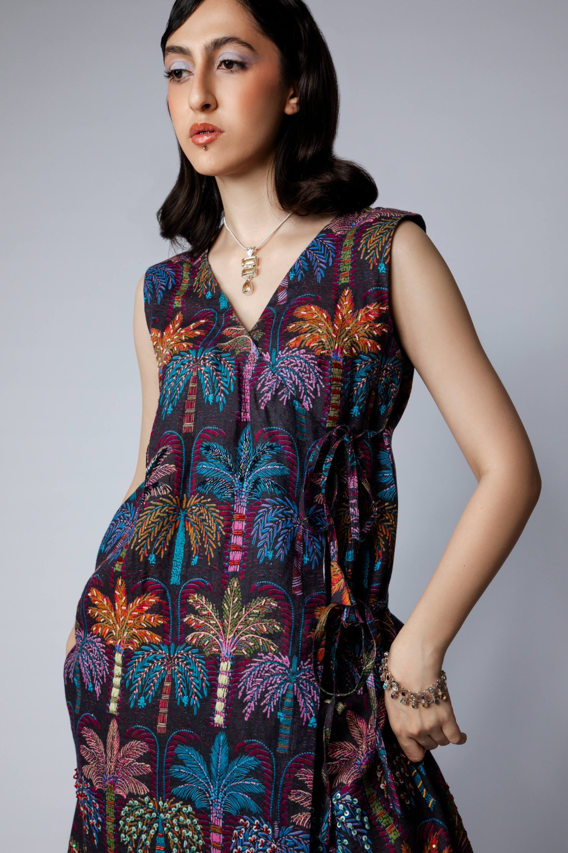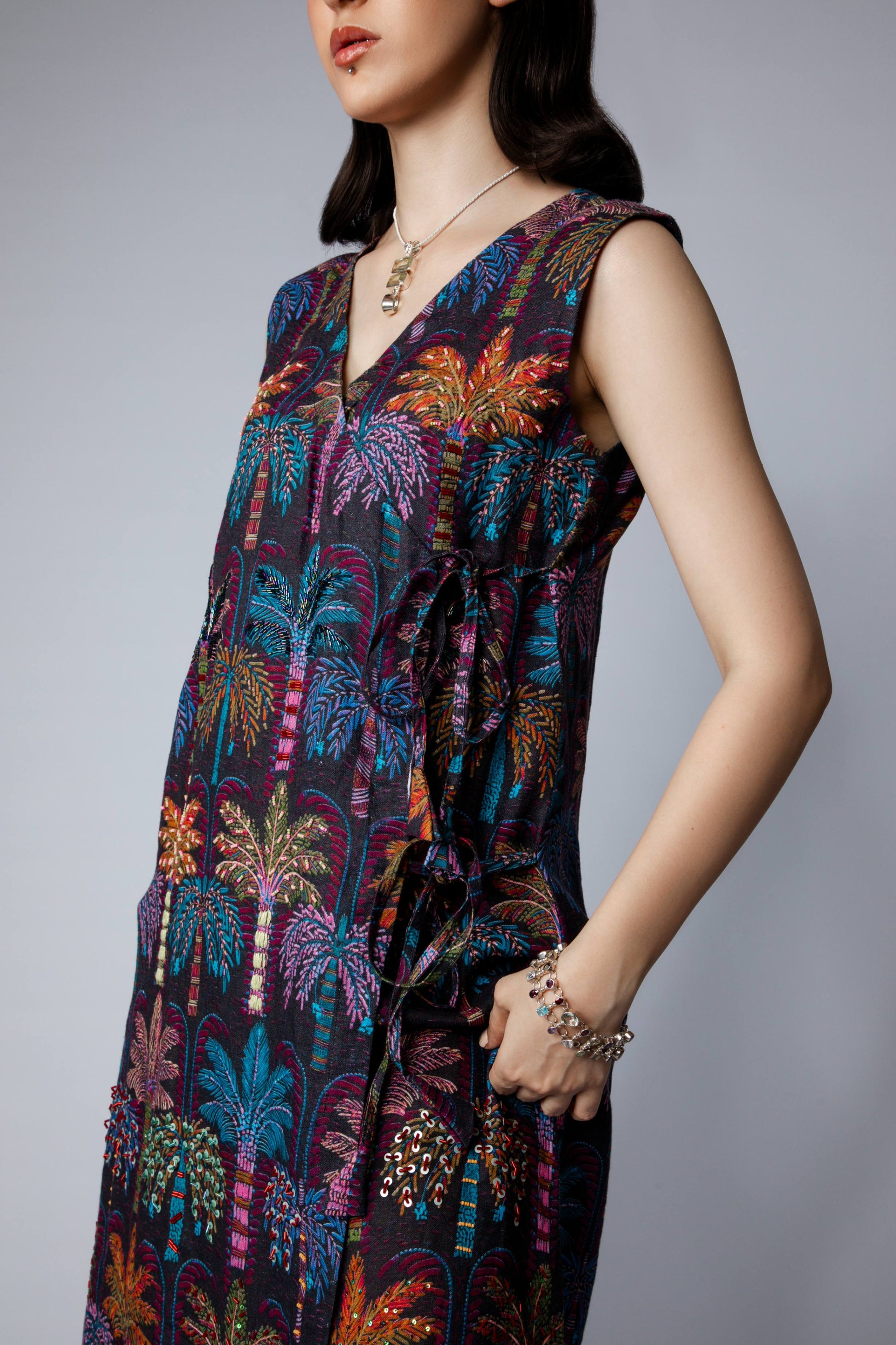 Embroidery: Palm motifs highlighted in knot stitch and beads in complimentary colors. Perfect to make the print sing.