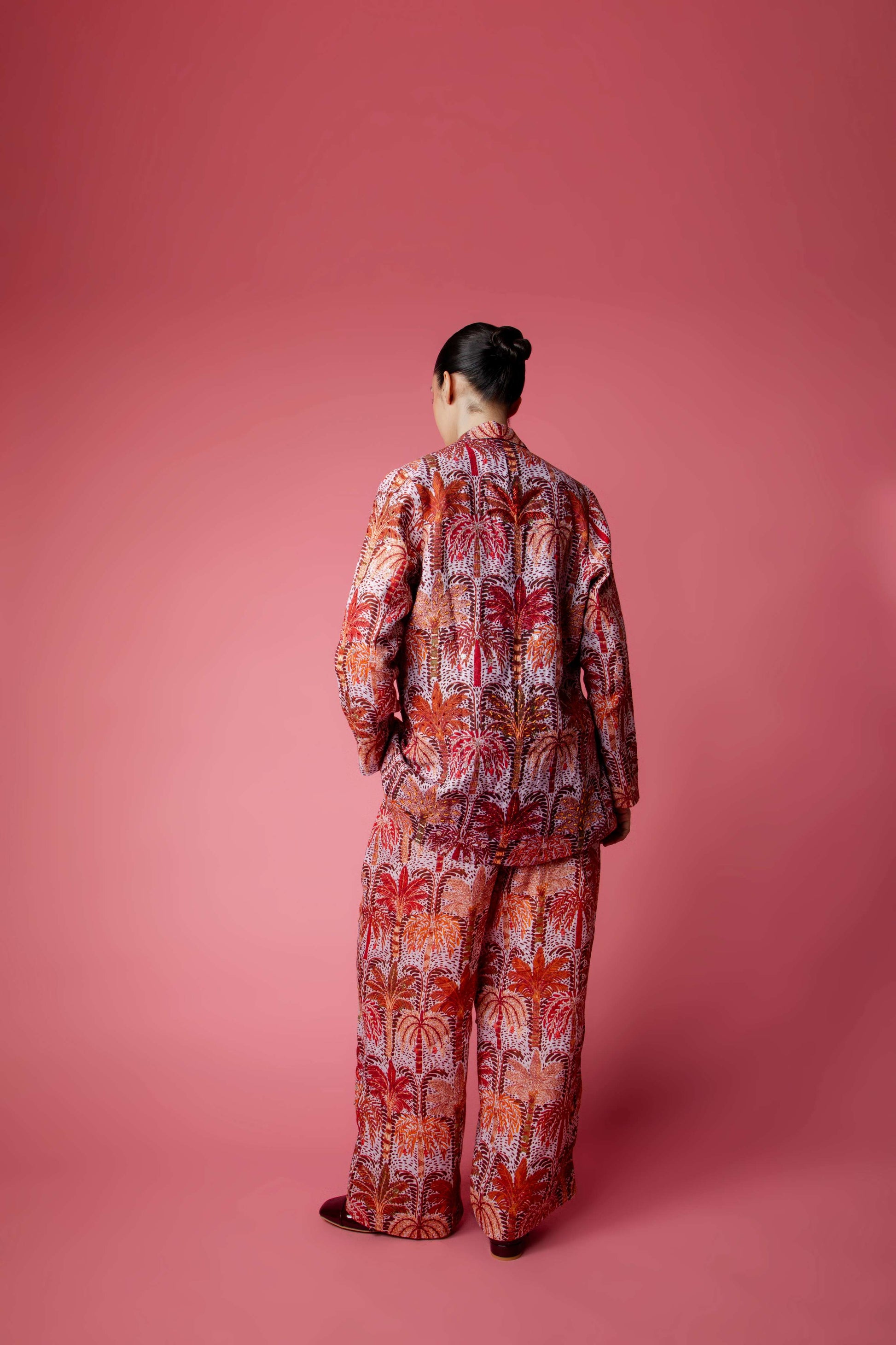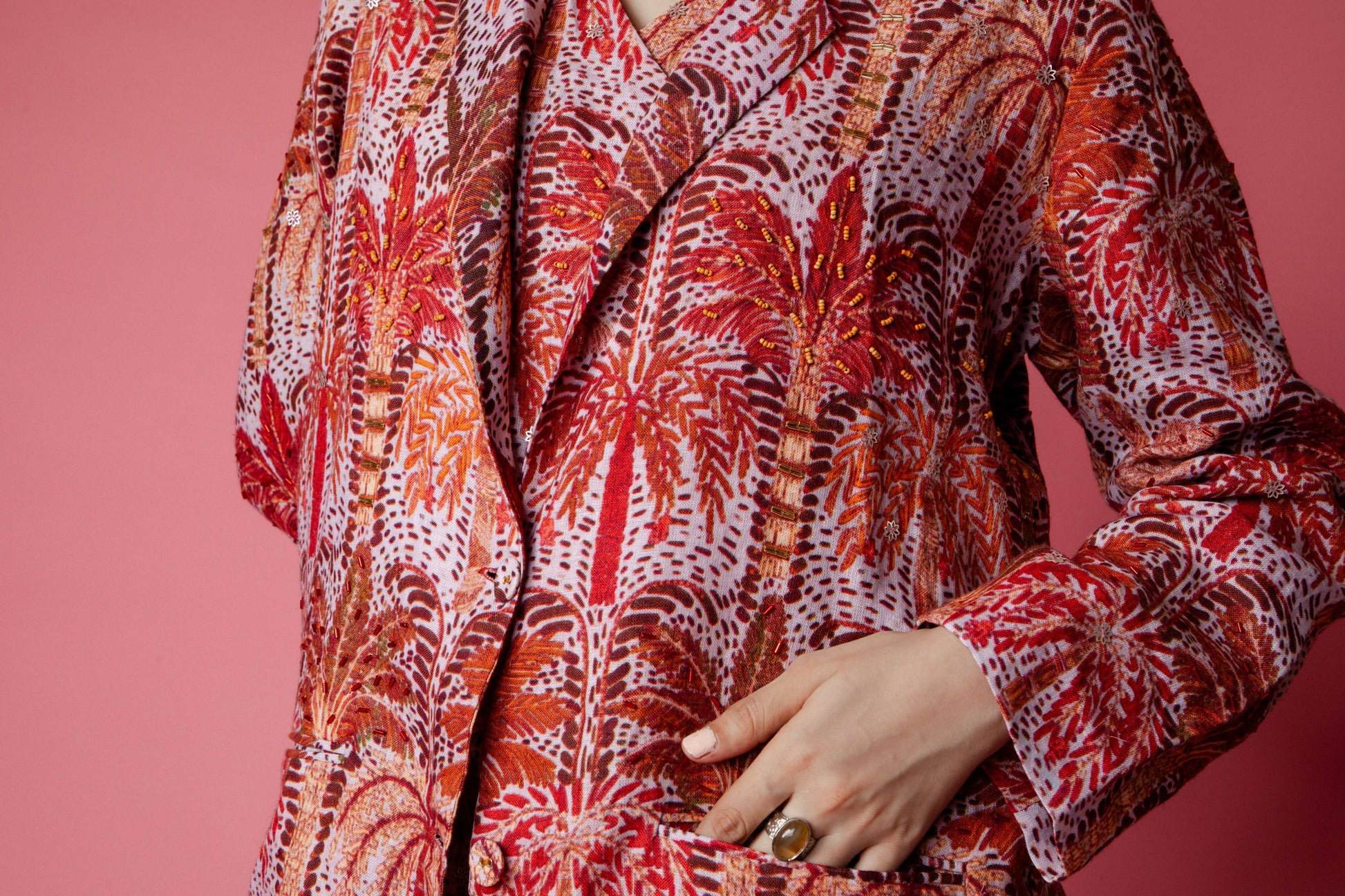 Tailored for the brave. This brown blazer is your ticket to effortless elevation. Cut from our signature moody palm print, it features intricate embellishments that catch the light without stealing the show. Sharp yet relaxed, it’s designed to pair perfectly with the matching pants or matching shorts or thrown over almost any style - a sleek slip dress, or even your boy pants. Style it with heels for glam, or sneakers for that laid-back, cool edge. Whether you're heading to a sundowner or stepping into a meeting, this blazer brings the breeze with style.
