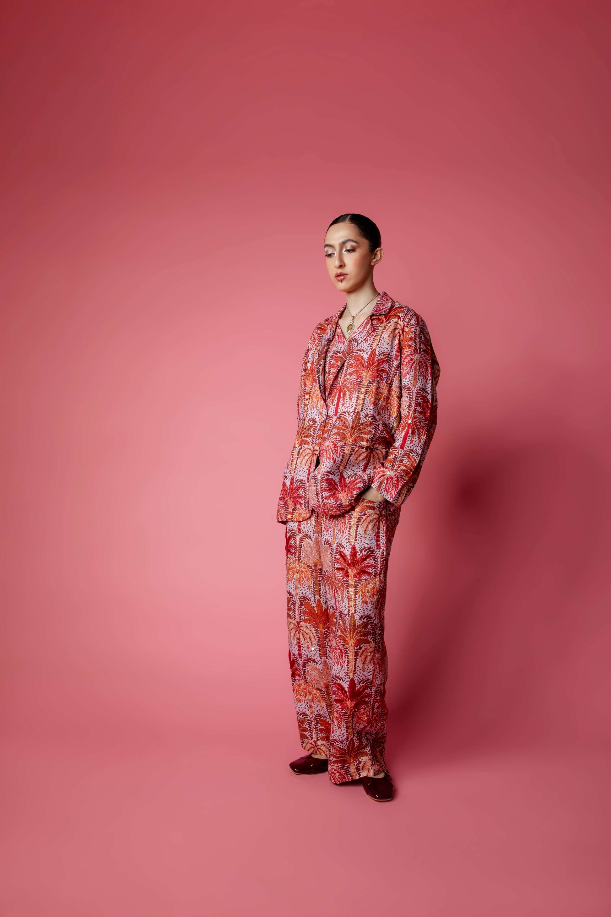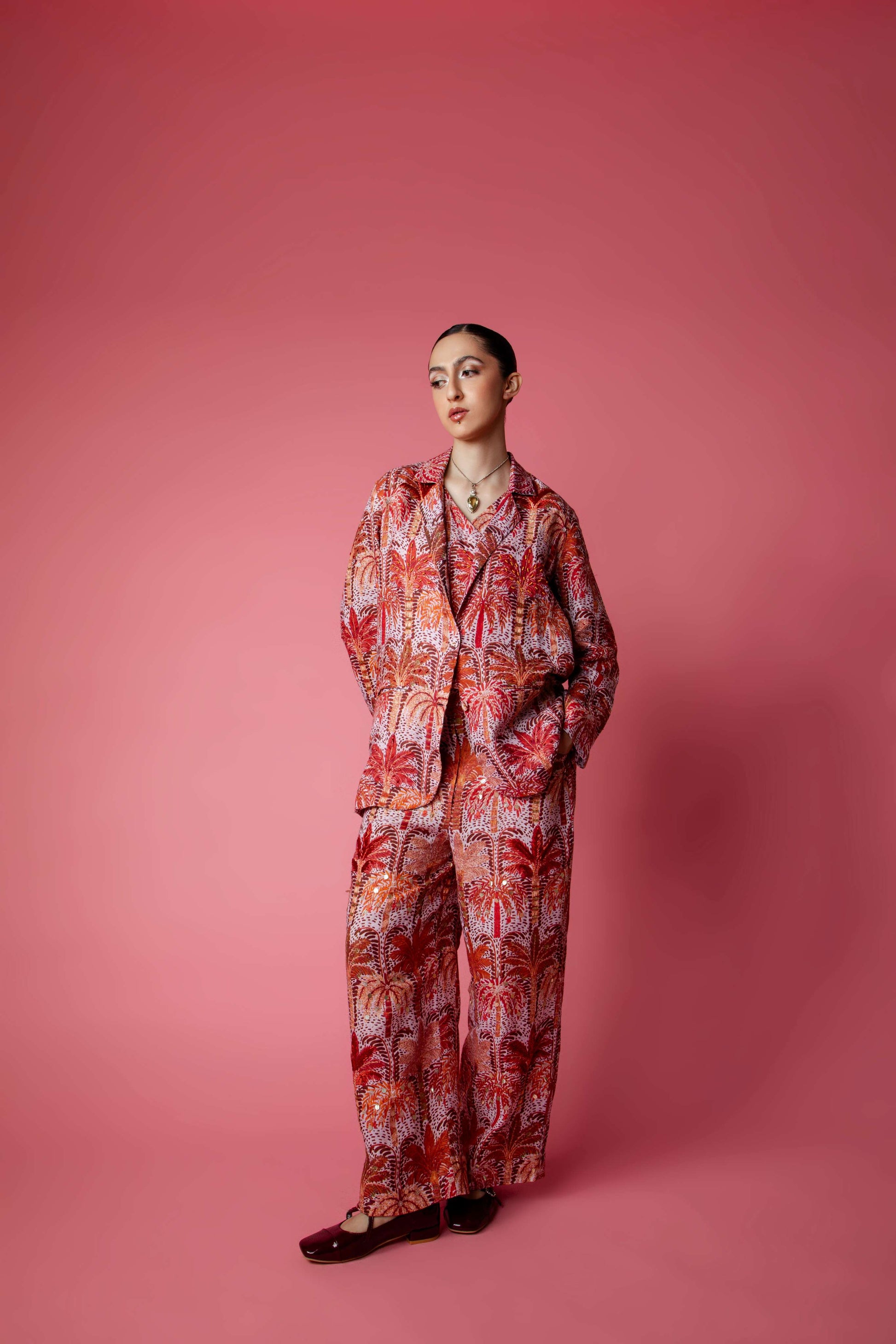 Tailored for the brave. This brown blazer is your ticket to effortless elevation. Cut from our signature moody palm print, it features intricate embellishments that catch the light without stealing the show. Sharp yet relaxed, it’s designed to pair perfectly with the matching coord set pants, or thrown over denim shorts, a sleek slip dress, or even your boy pants. Style it with heels for glam, or sneakers for that laid-back, cool edge. Whether you're heading to a sundowner or stepping into a meeting, this blazer brings the breeze with style.