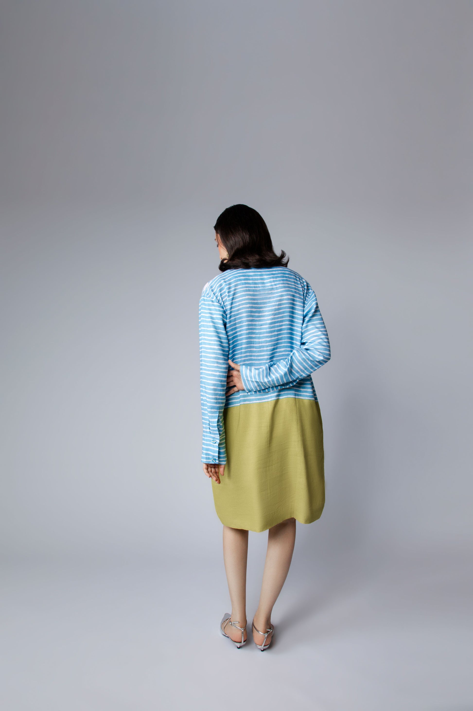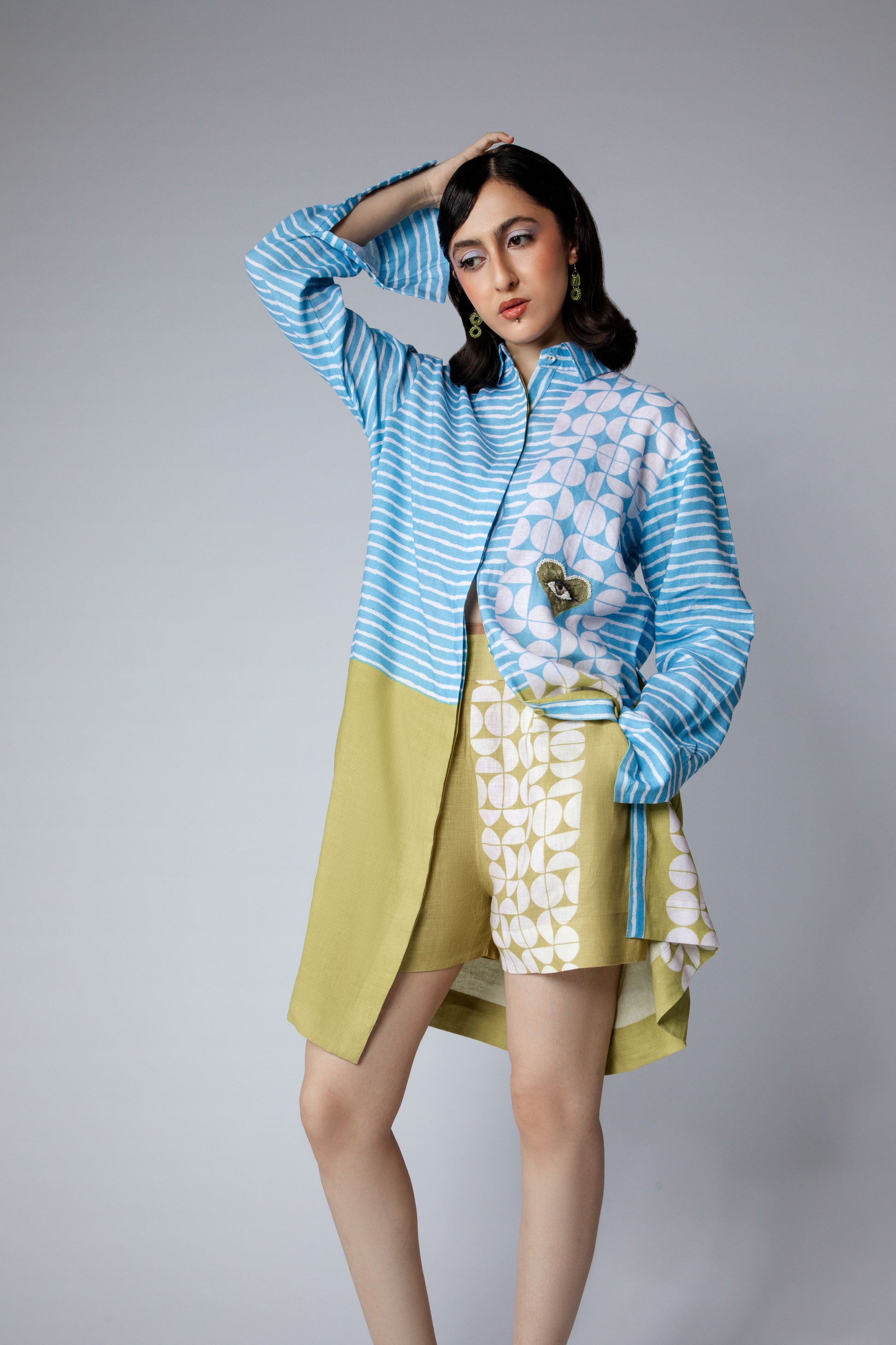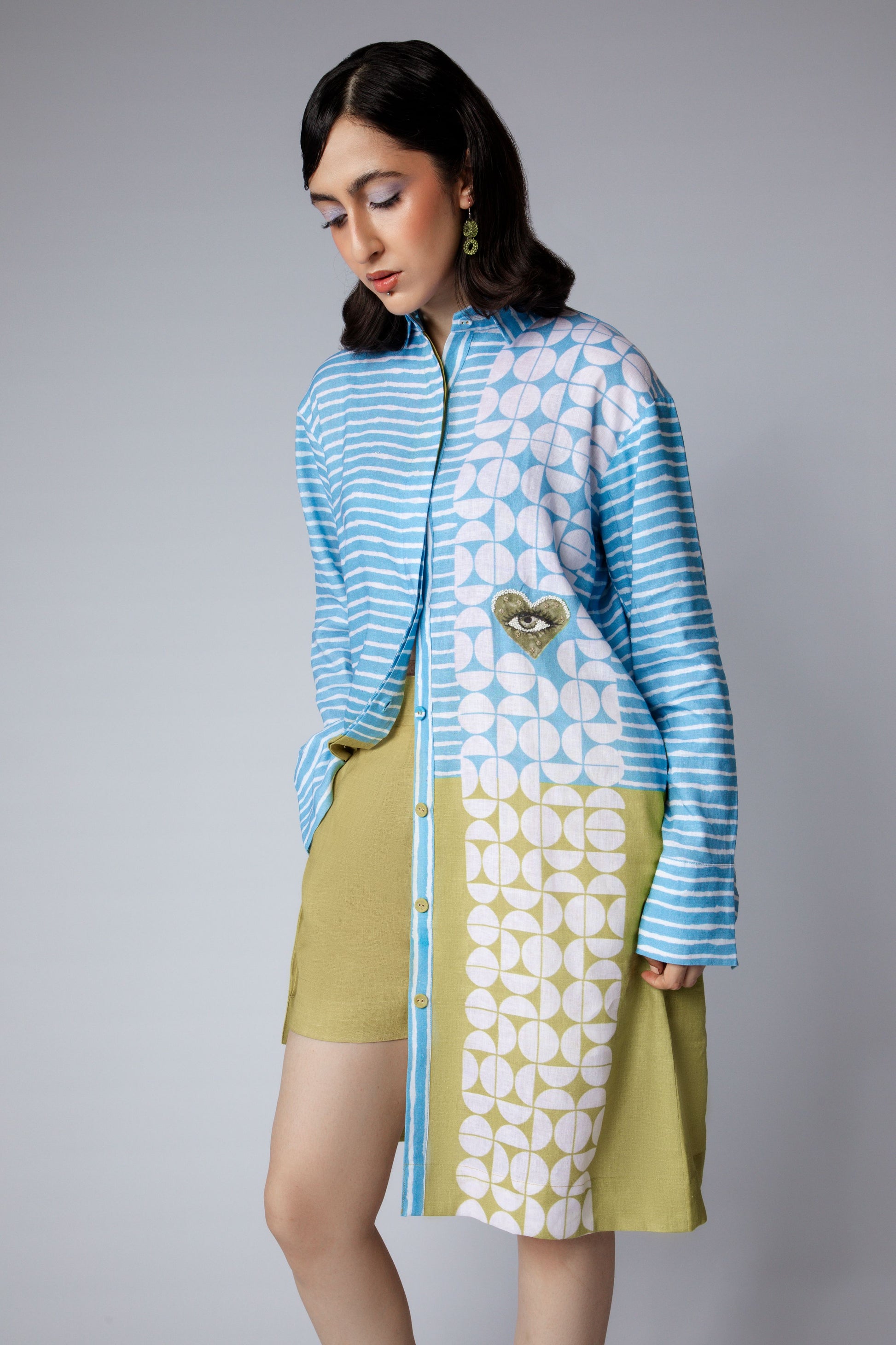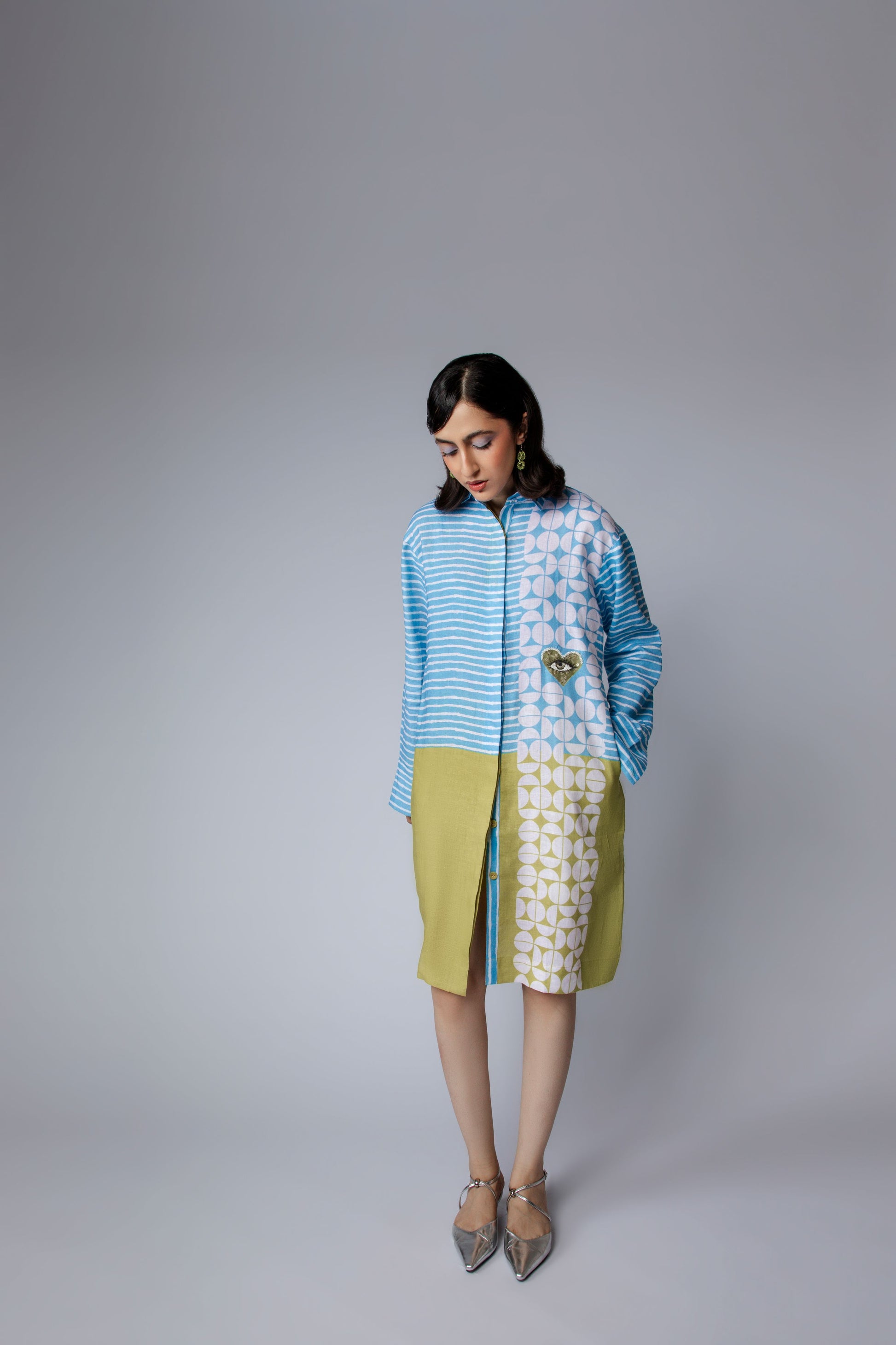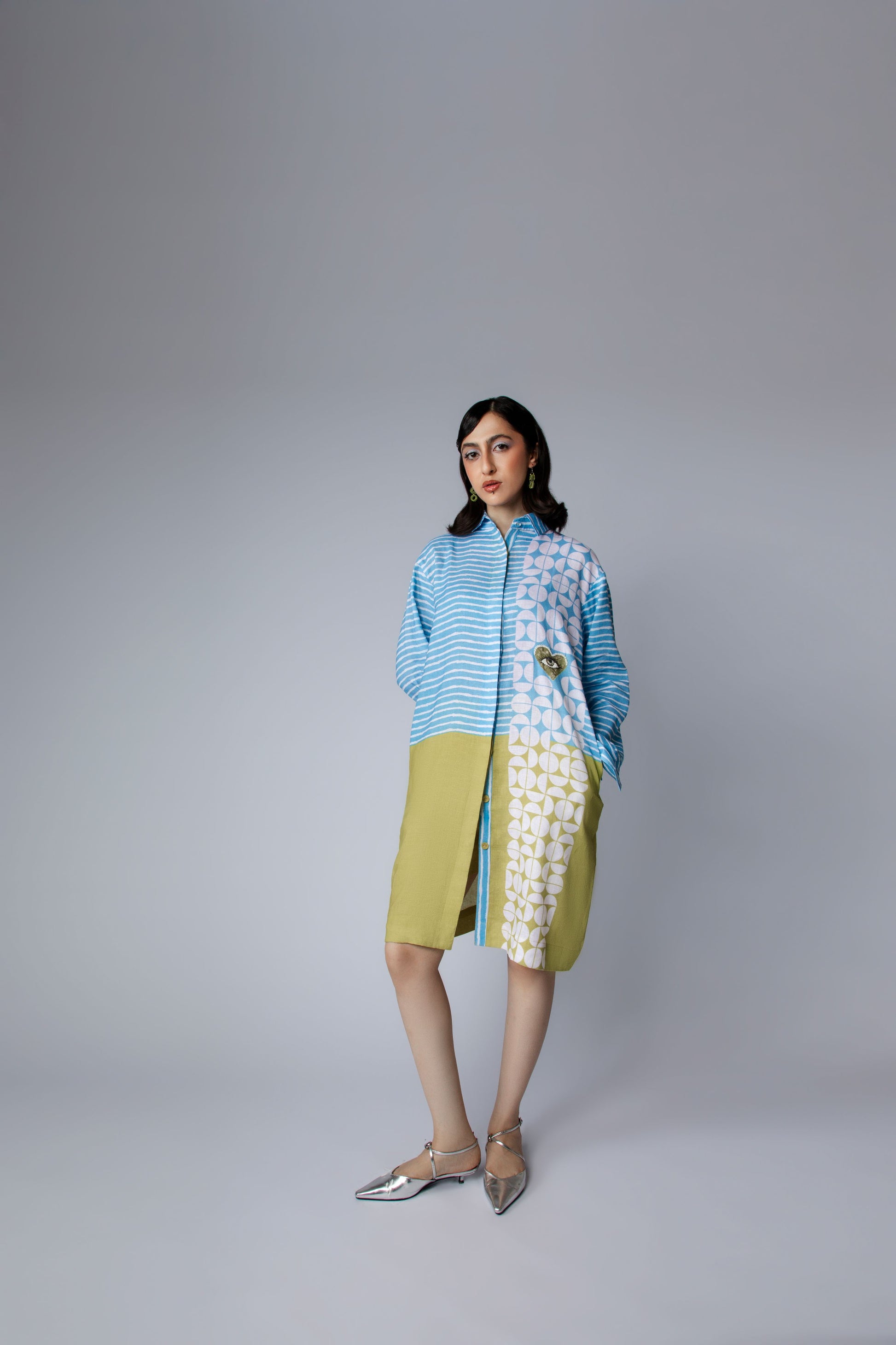 The eye has it. A long sleeve shirt dress in turquoise blue and lime green with geometric print and our signature eye-in-a-heart hand-embellished with beads. Pair it with the matching bottoms - sold separately. Perfect for cooler days when you still want to stand out.