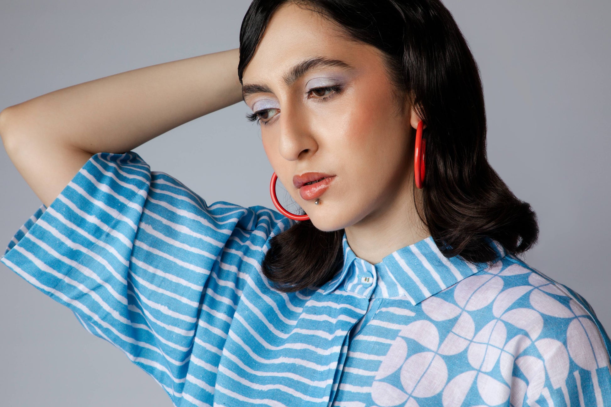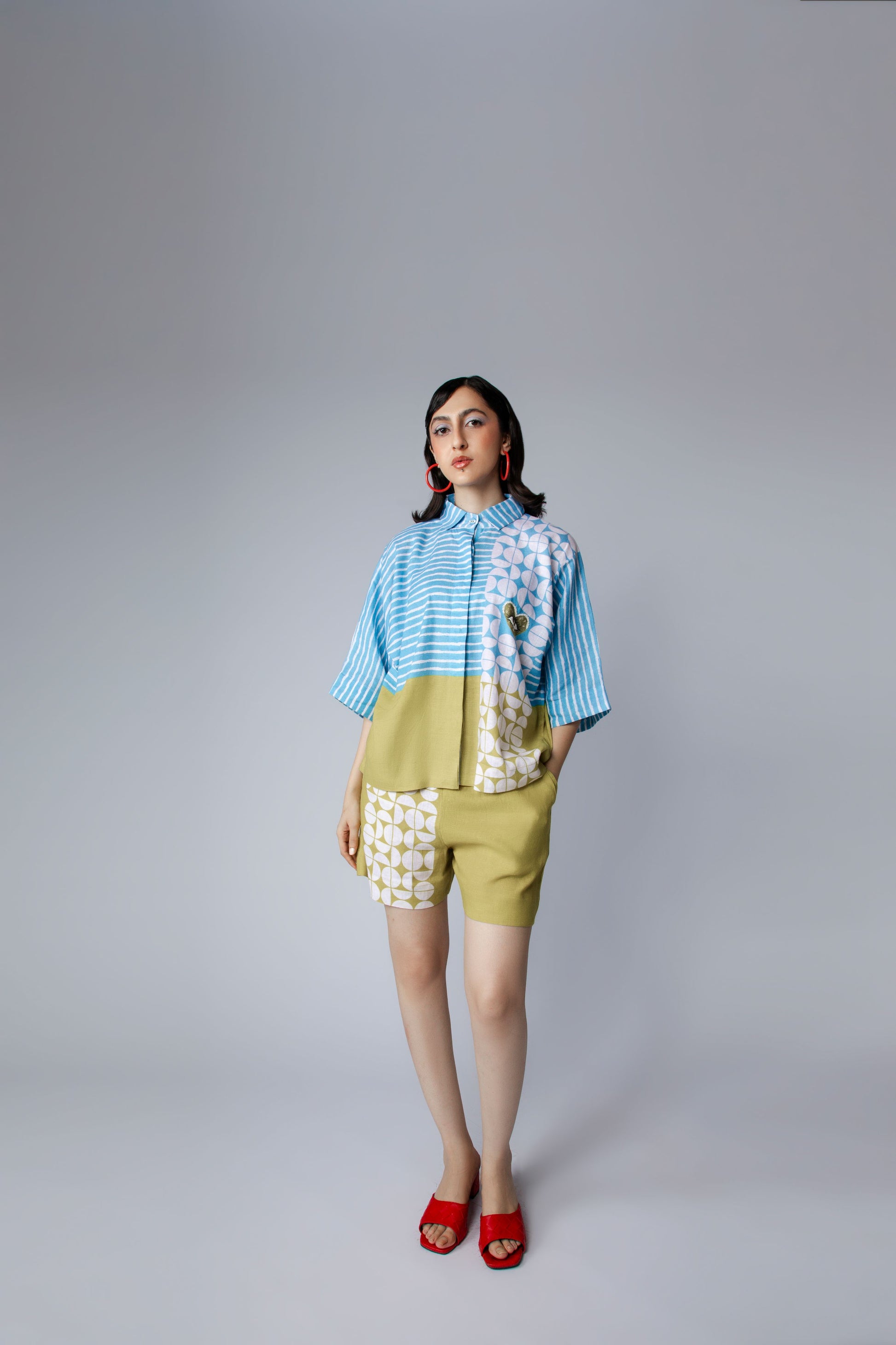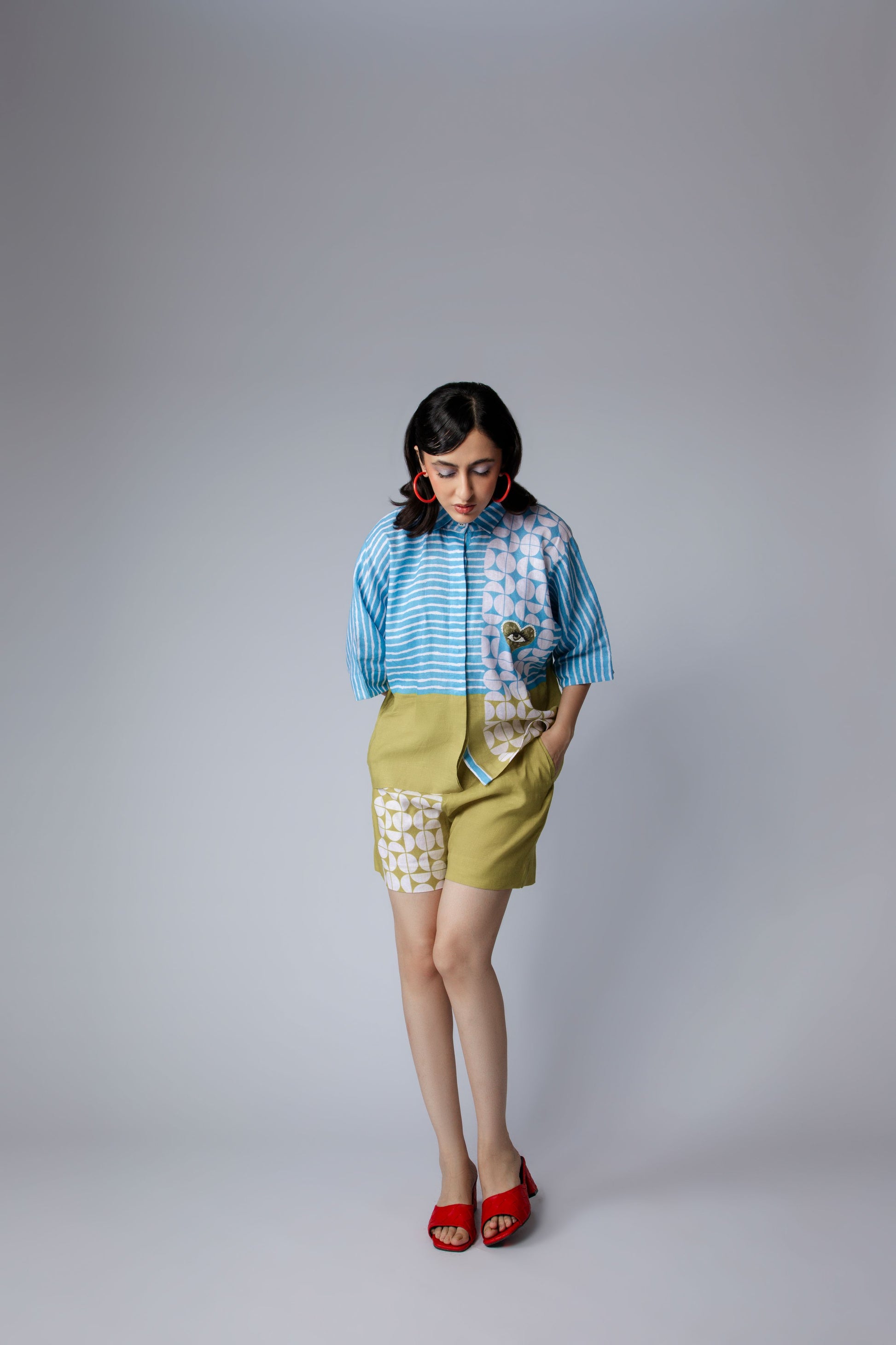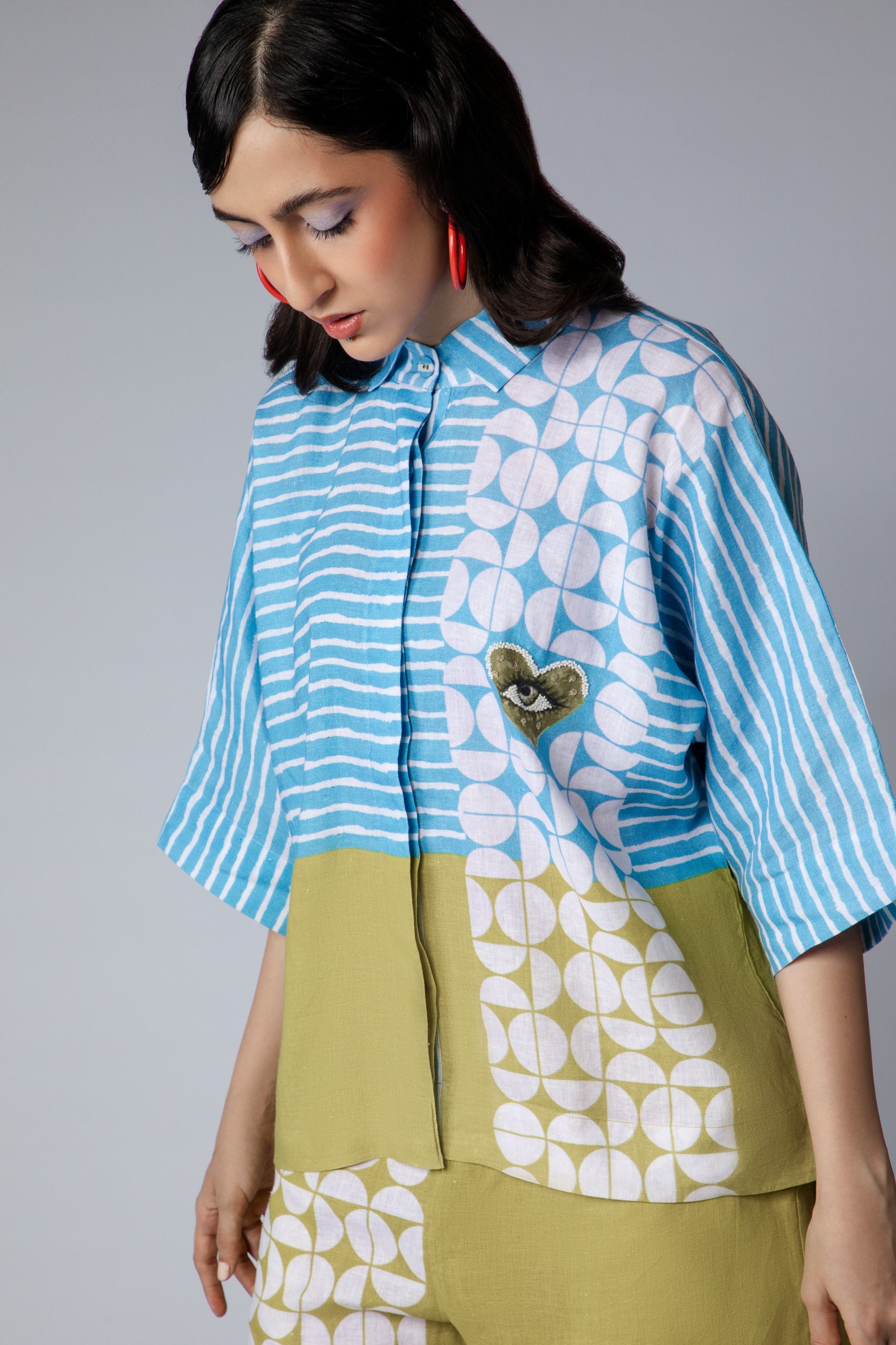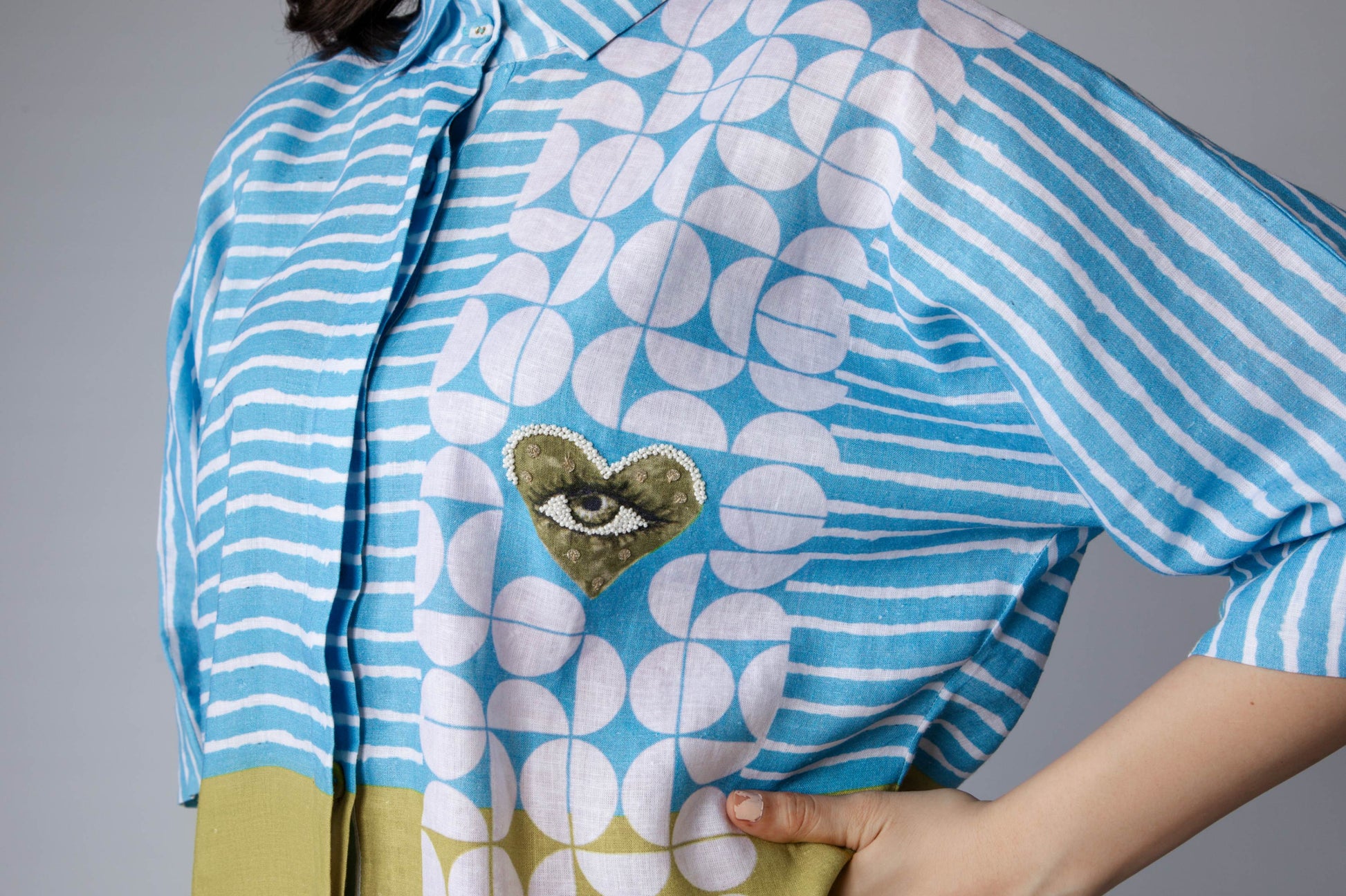 Effortless and artful, this button-down shirt set drapes softly with painterly turquoise blue stripes that feel inspired, not forced. The relaxed fit and open collar stay true to the “Cut the Crap by Arva” ethos. Relaxed style, intentional design. Lightweight and breathable, this piece is as comfortable as it is expressive. No unnecessary detailing just the heart and the color's shine.