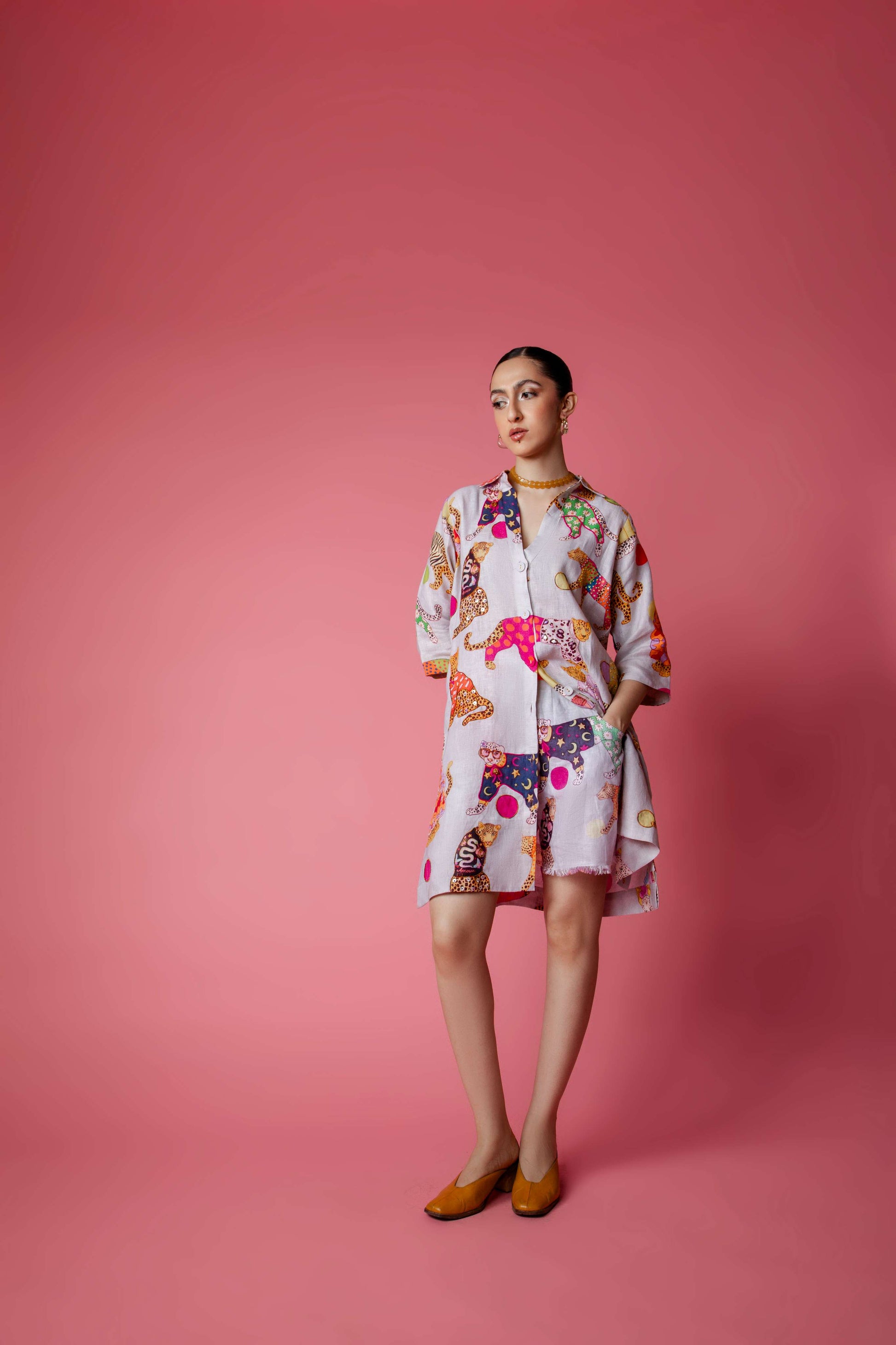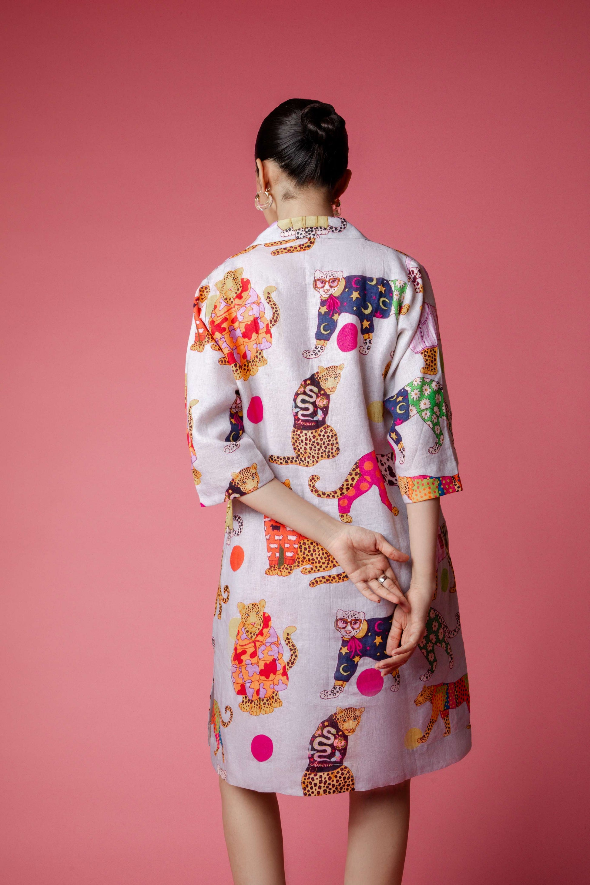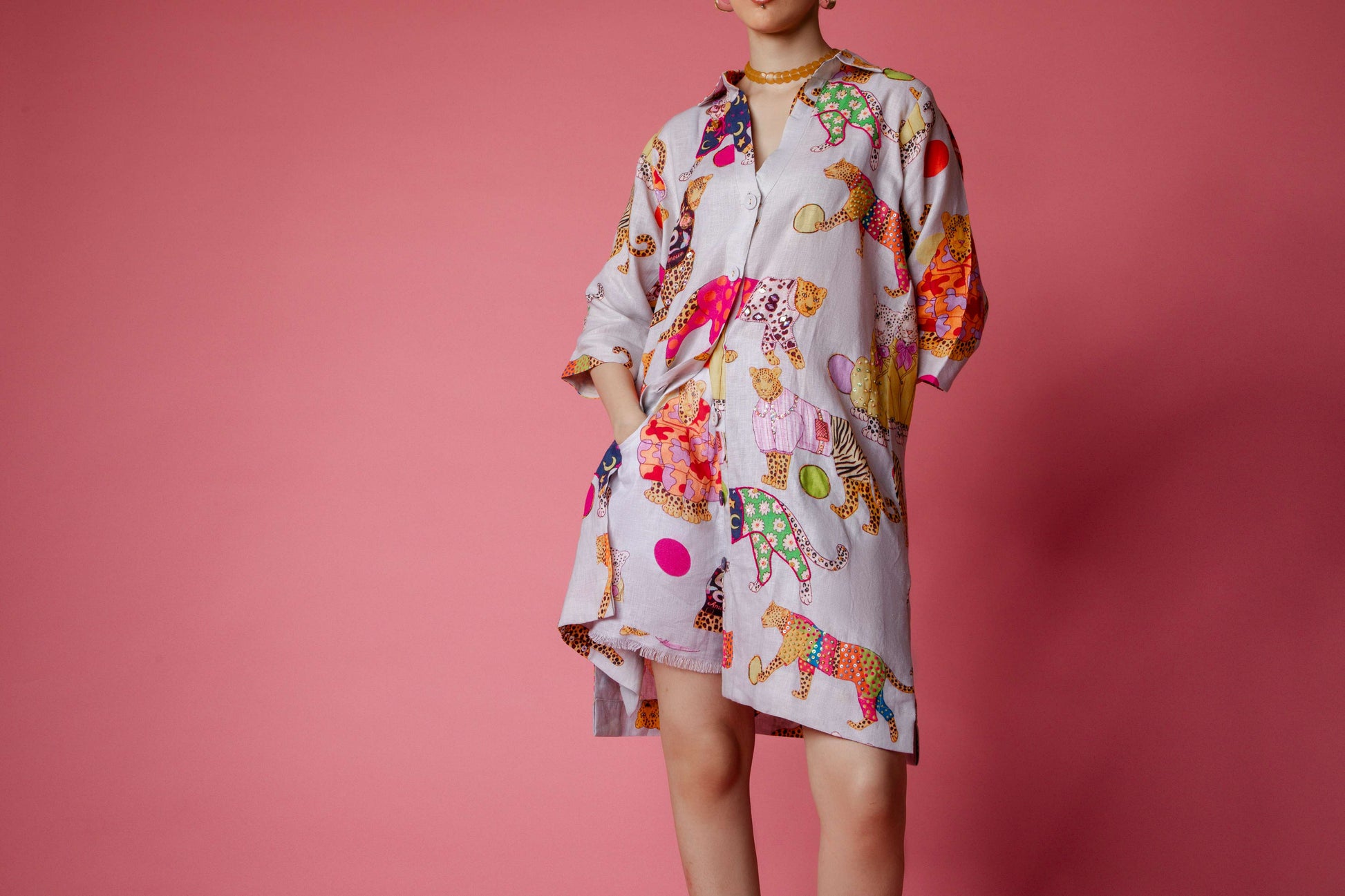 Loud cats. Louder style. This Light gray 100 percent linen shirt dress is a riot of personality, with leopards dressed sharper than most humans. embellished details with tiny bells to complete the drama. Cut in a relaxed, midi-length silhouette with long sleeves and a classic collar, it's available in two bold colors that make zero apologies. paired with sneakers or boots, you will not just wear a dress, you will make make an entrance