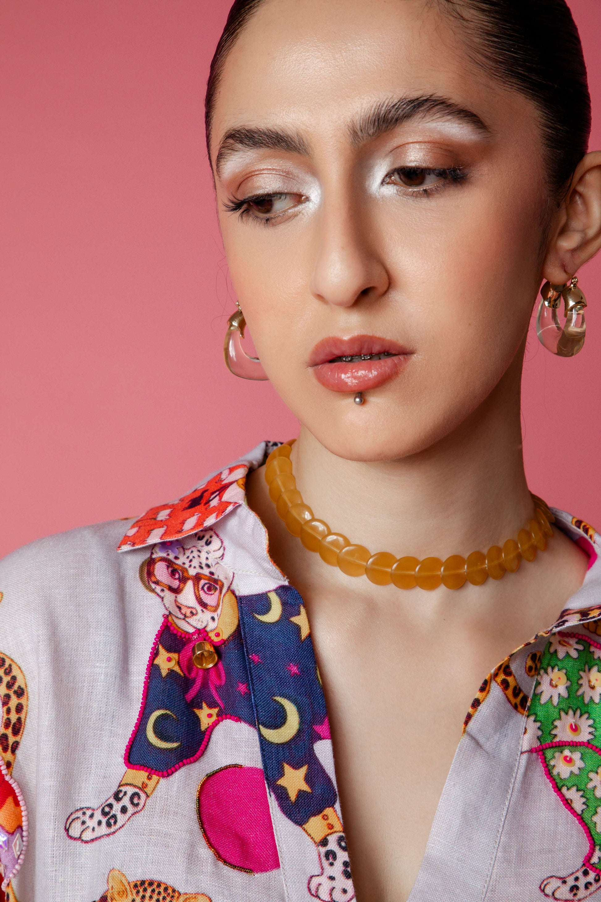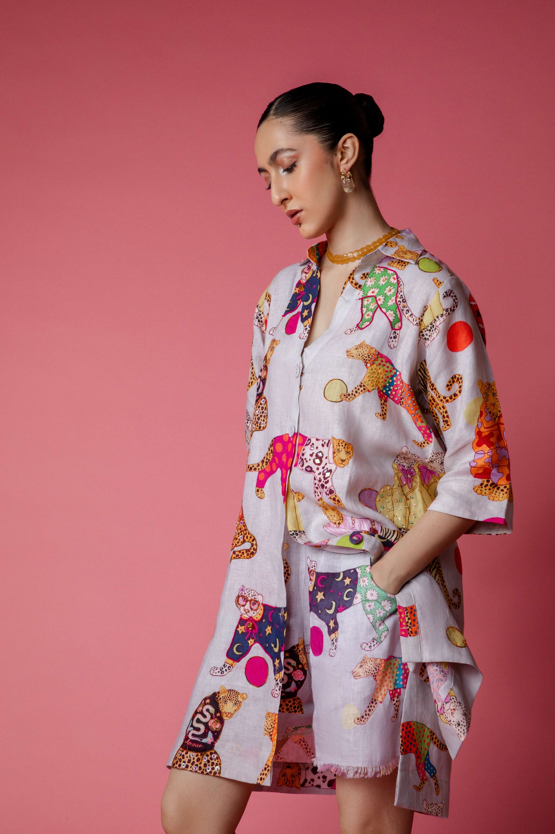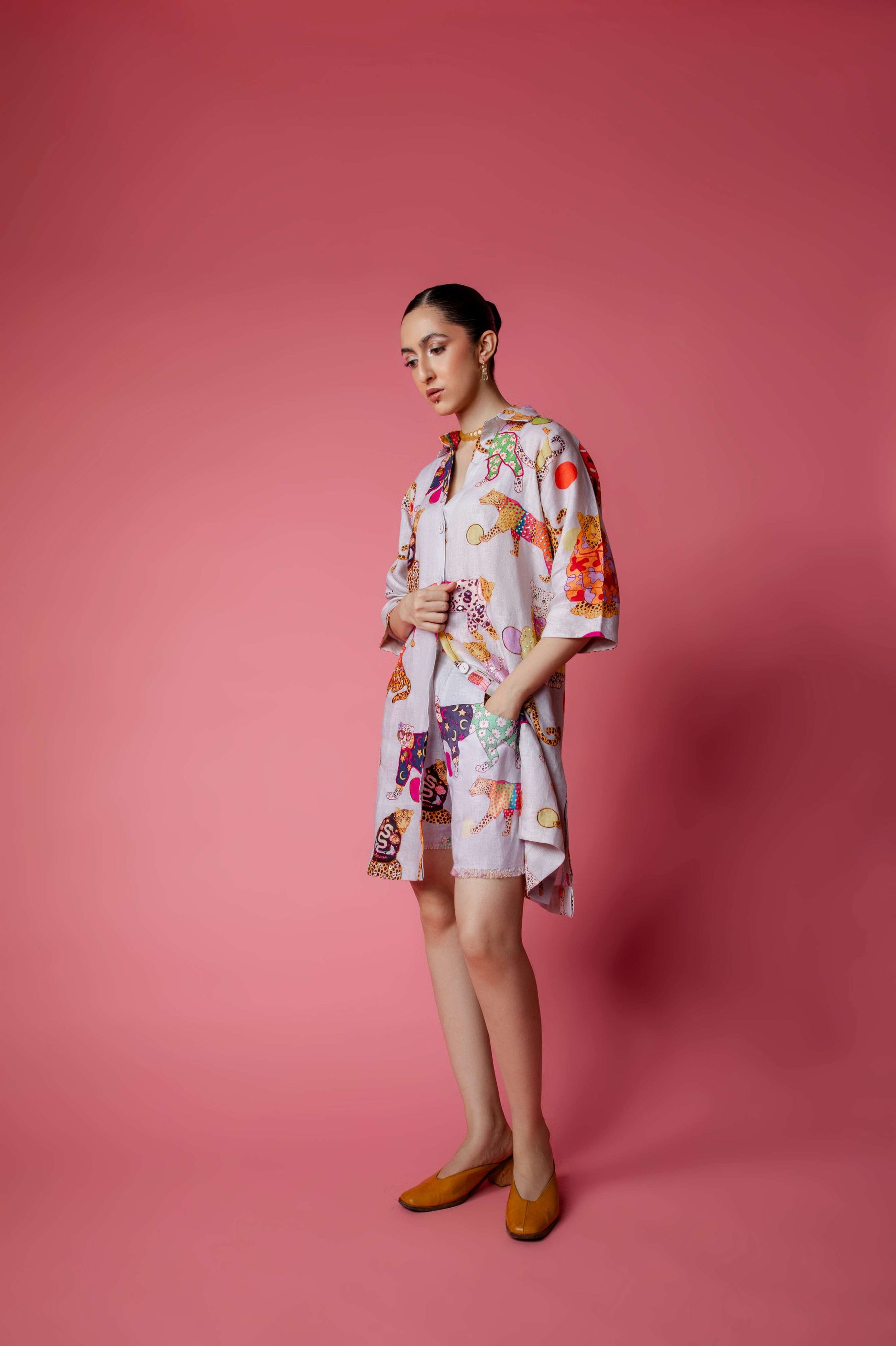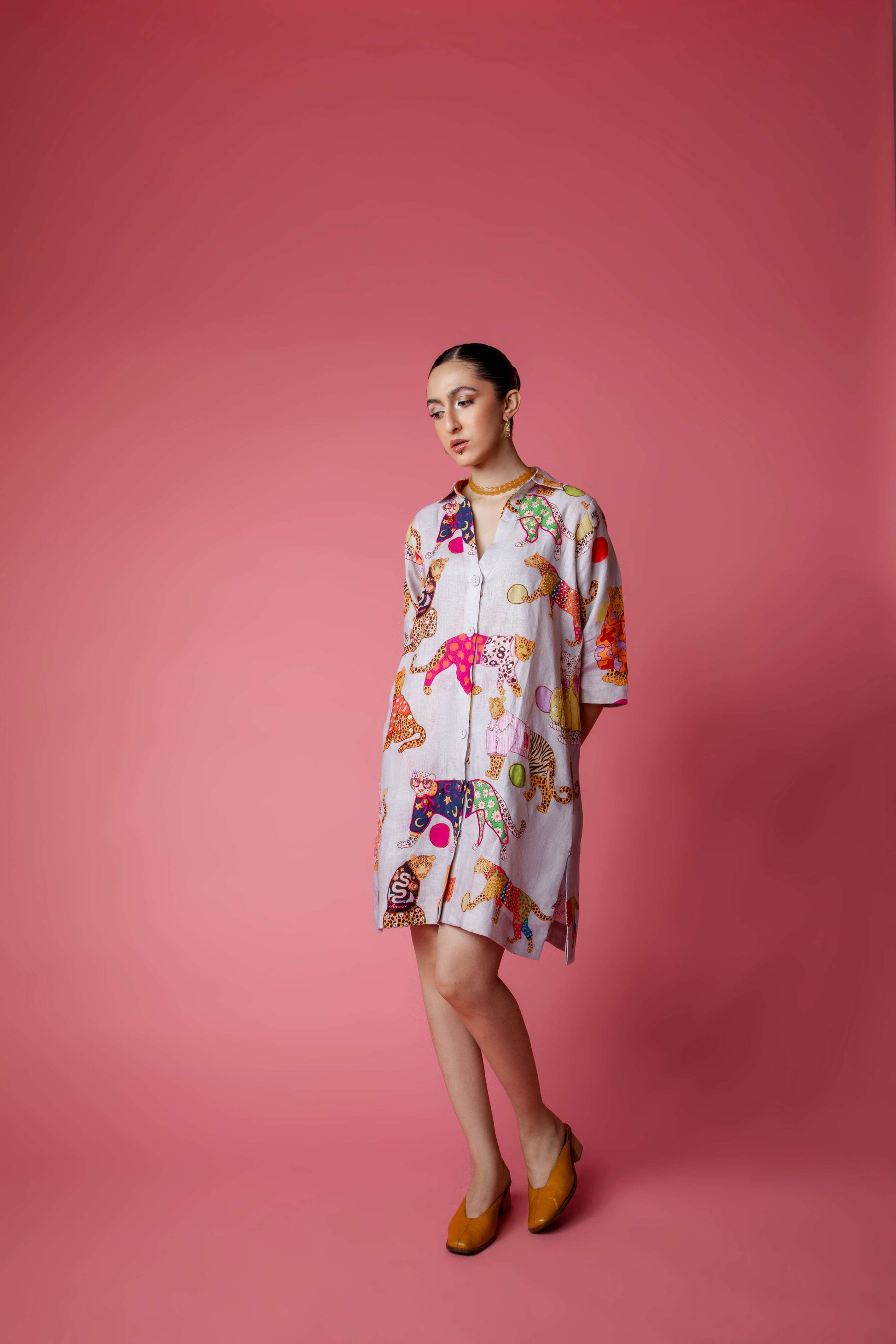 Loud cats. Louder style. This Light gray 100 percent linen shirt dress is a riot of personality, with leopards dressed sharper than most humans. embellished details with tiny bells to complete the drama. Cut in a relaxed, midi-length silhouette with long sleeves and a classic collar, it's available in two bold colors that make zero apologies. paired with sneakers or boots, you will not just wear a dress, you will make make an entrance