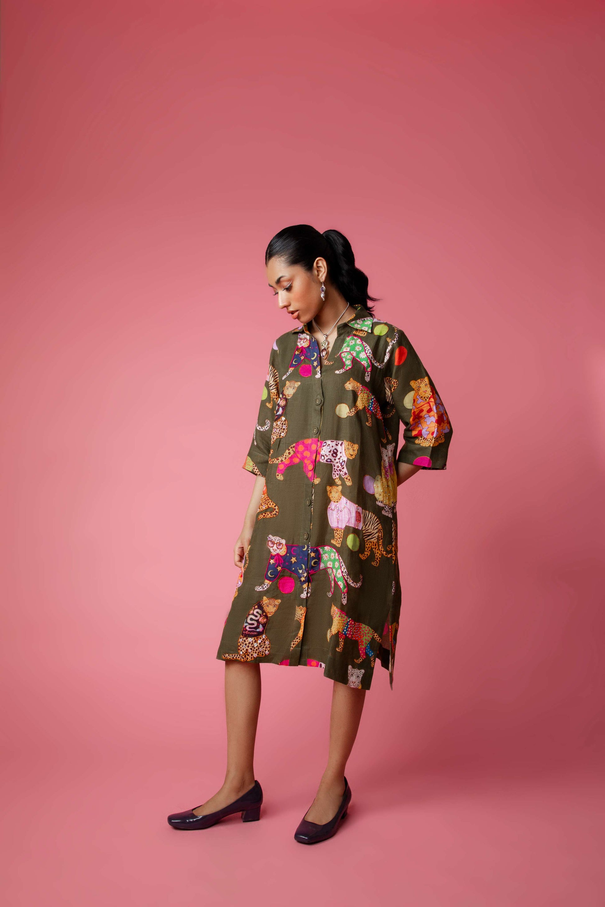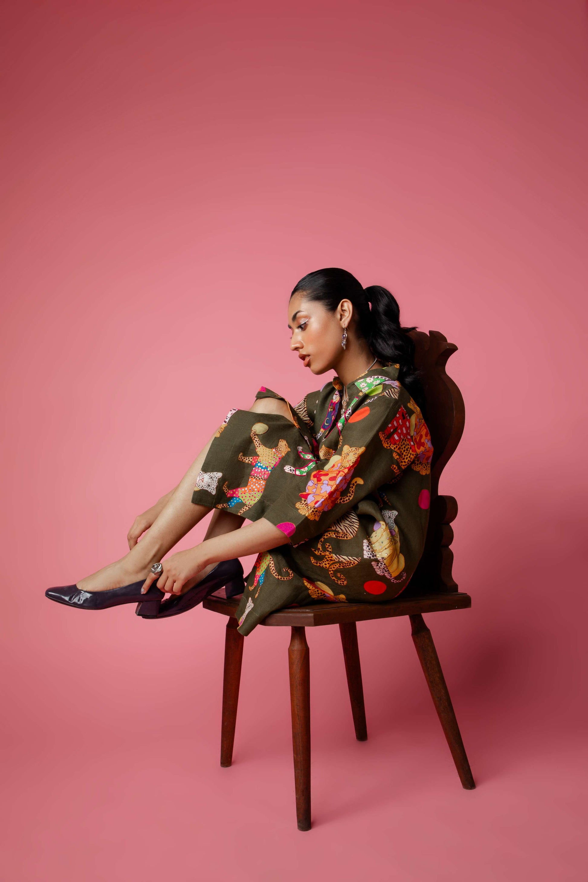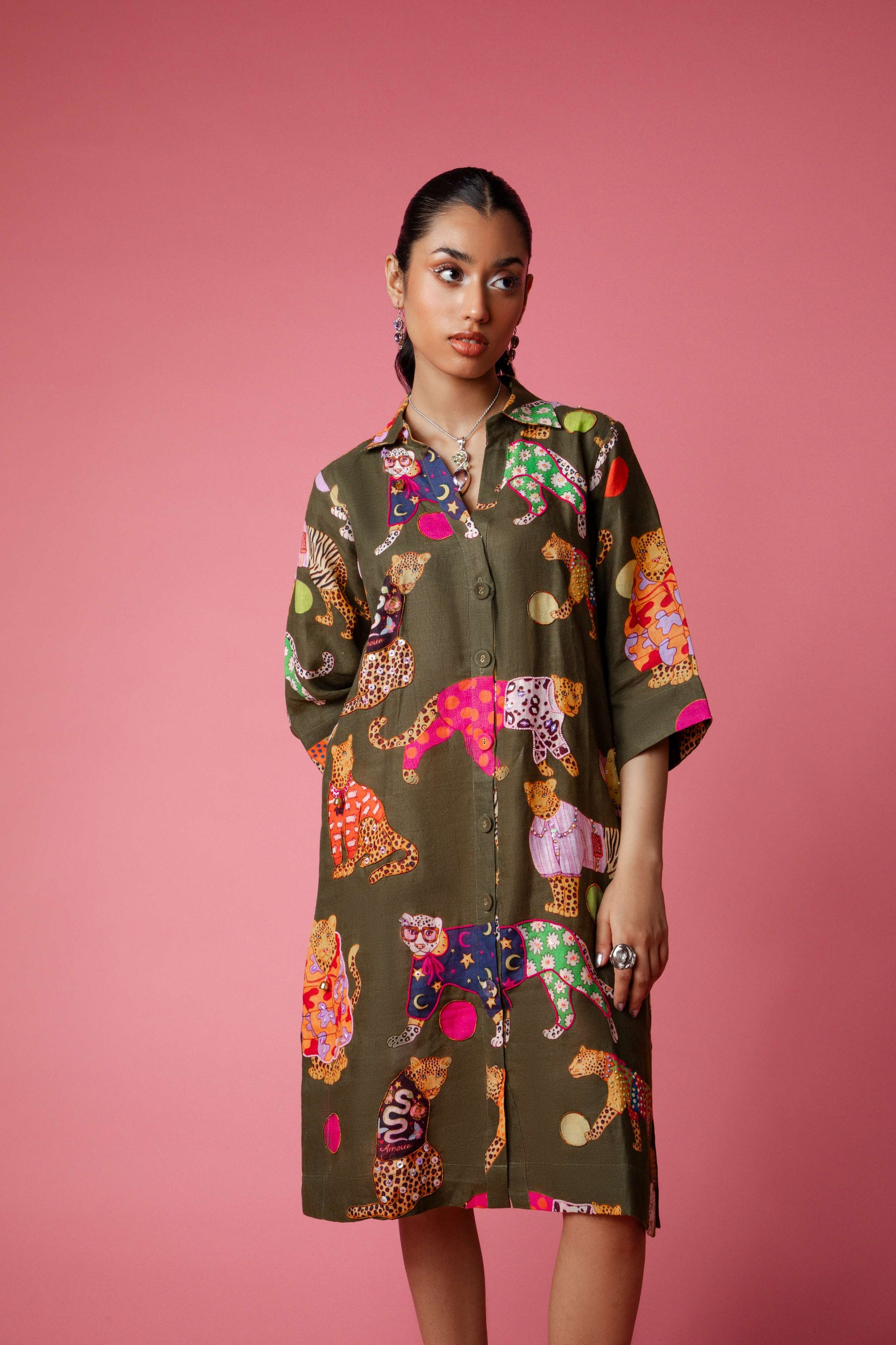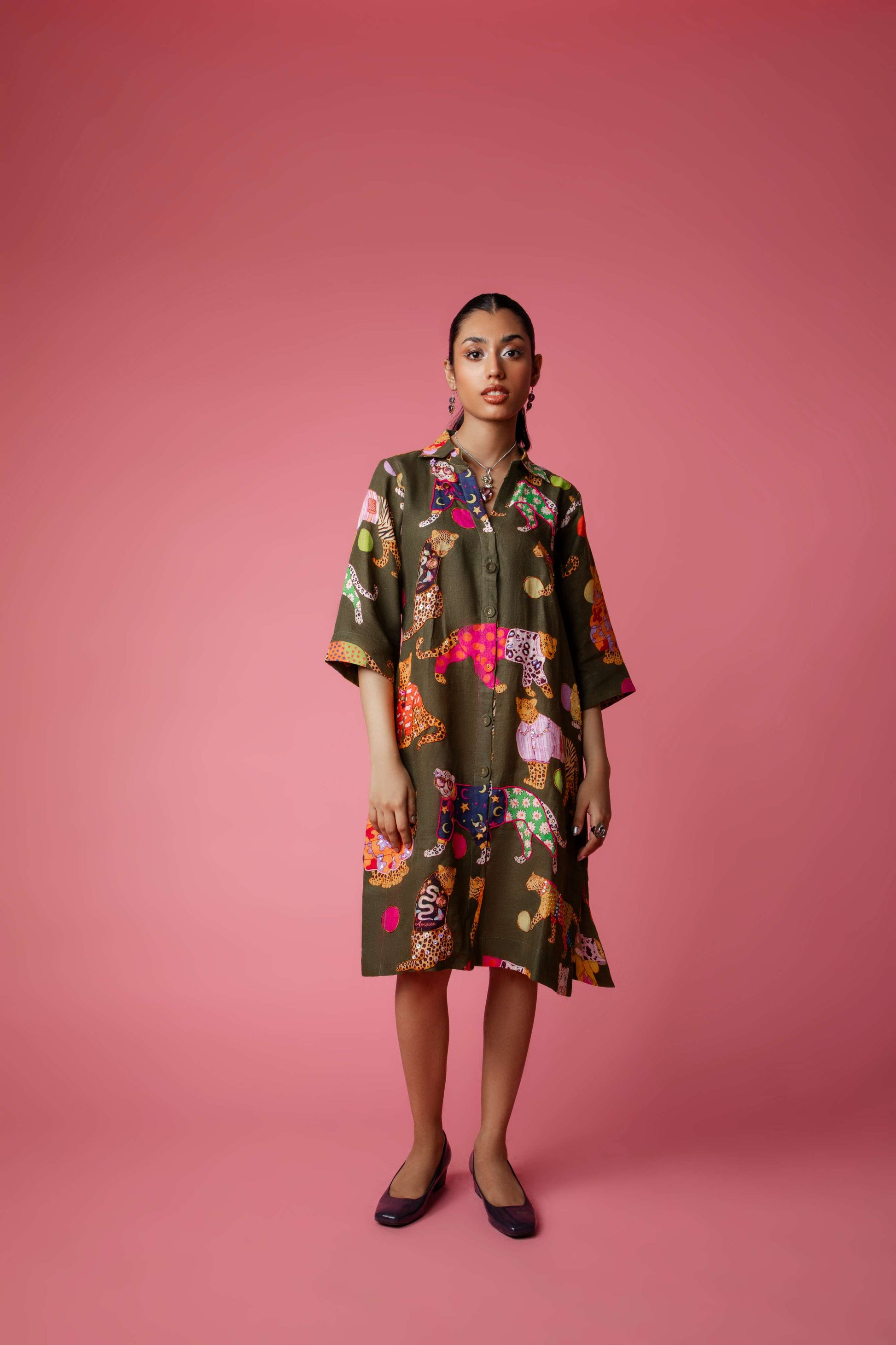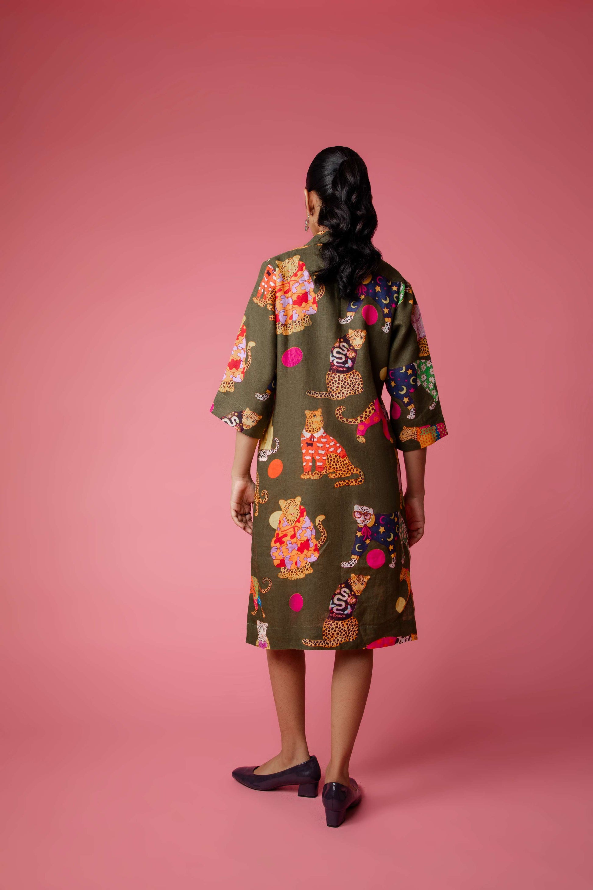 Loud cats. Louder style. This military green 100 percent linen shirt dress is a riot of personality, with leopards dressed sharper than most humans. embellished details with tiny bells to complete the drama. Cut in a relaxed, midi-length silhouette with long sleeves and a classic collar, it's available in two bold color ways that make zero apologies. paired with sneakers or boots, you will not just wear a dress, you will make make an entrance