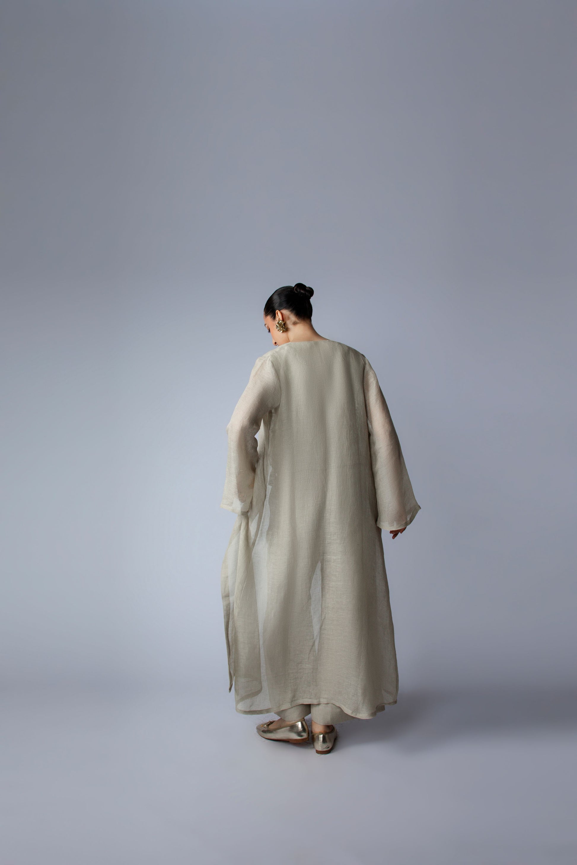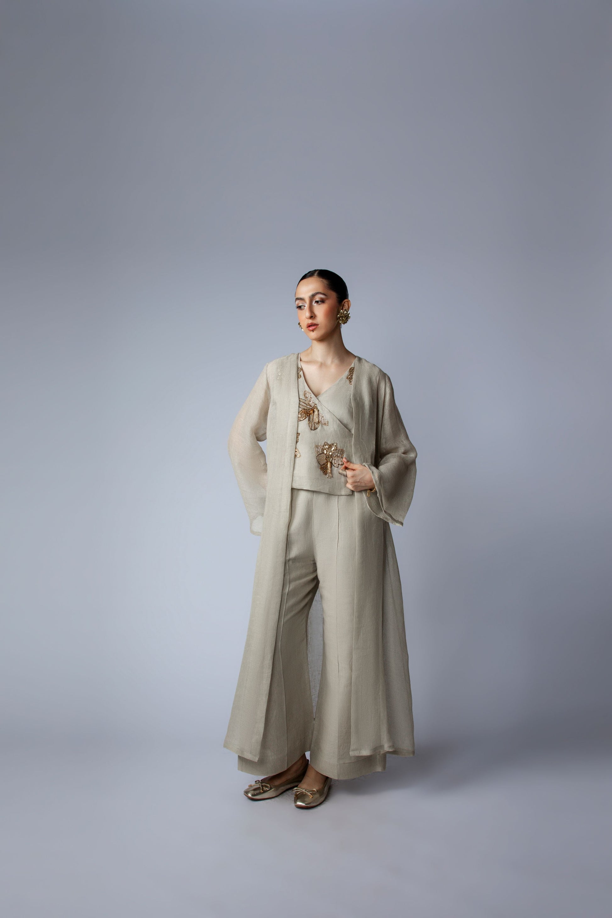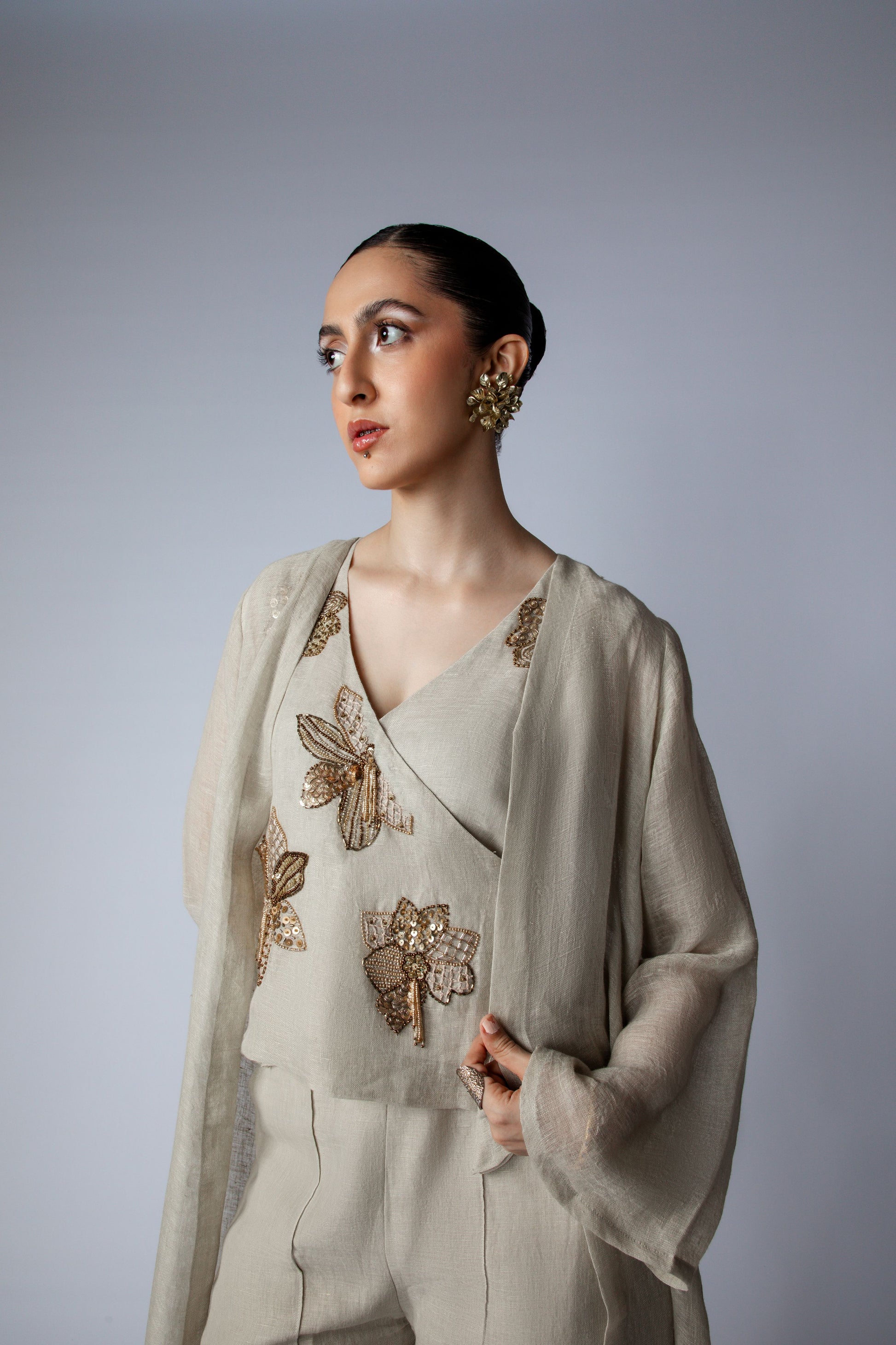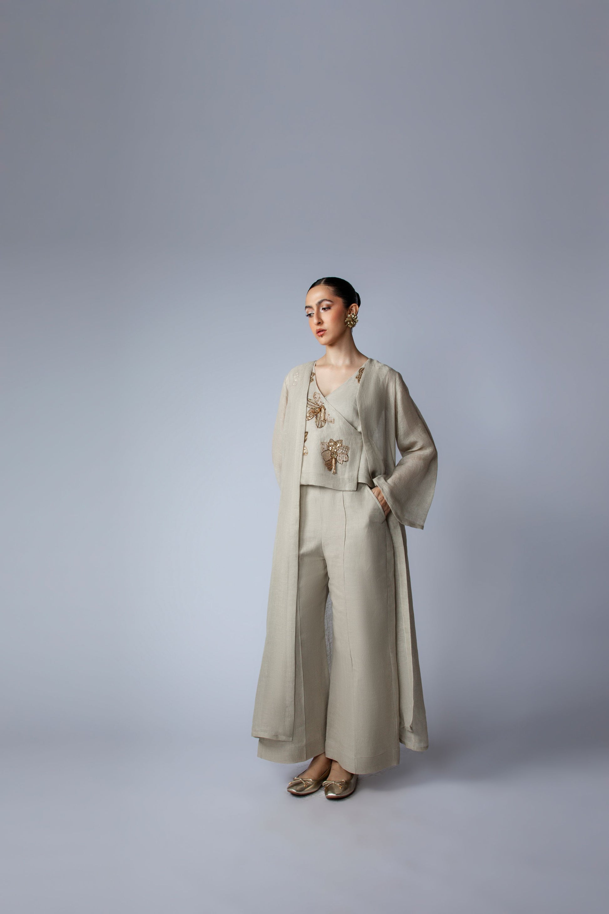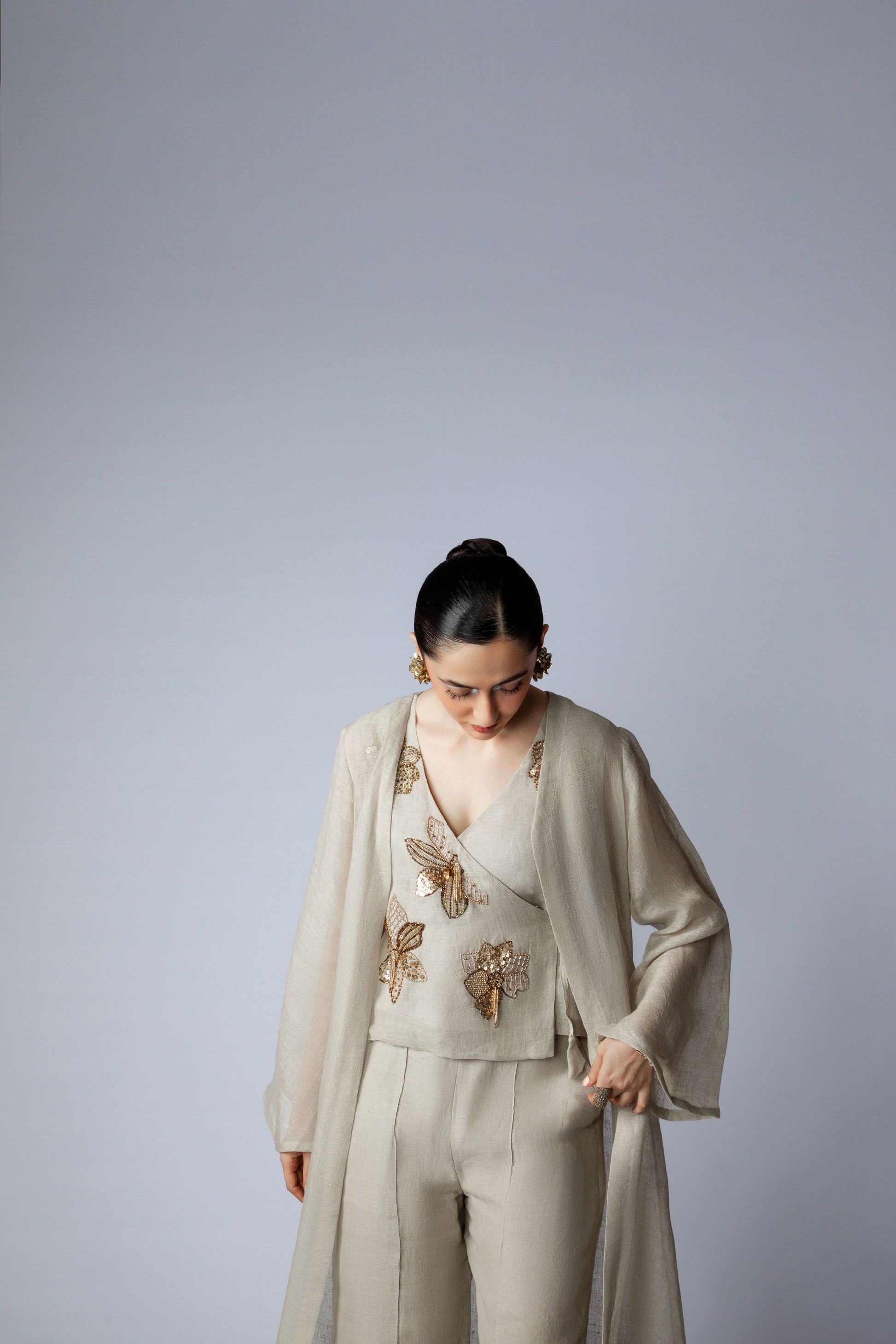 It’s a breezy linen-blend ensemble made to feel as good as it looks. The wrap-style top closes cleanly with subtle metallic floral appliqués that bring effortless elegance. High-waist, wide-leg trousers balance comfort with a slouchy sophistication and really let you move. Wear it from dawn-to-dinner, pairing it with sandals or your go-to statement earrings. Honest, light-care fabric that softens with time. No fuss, all class.