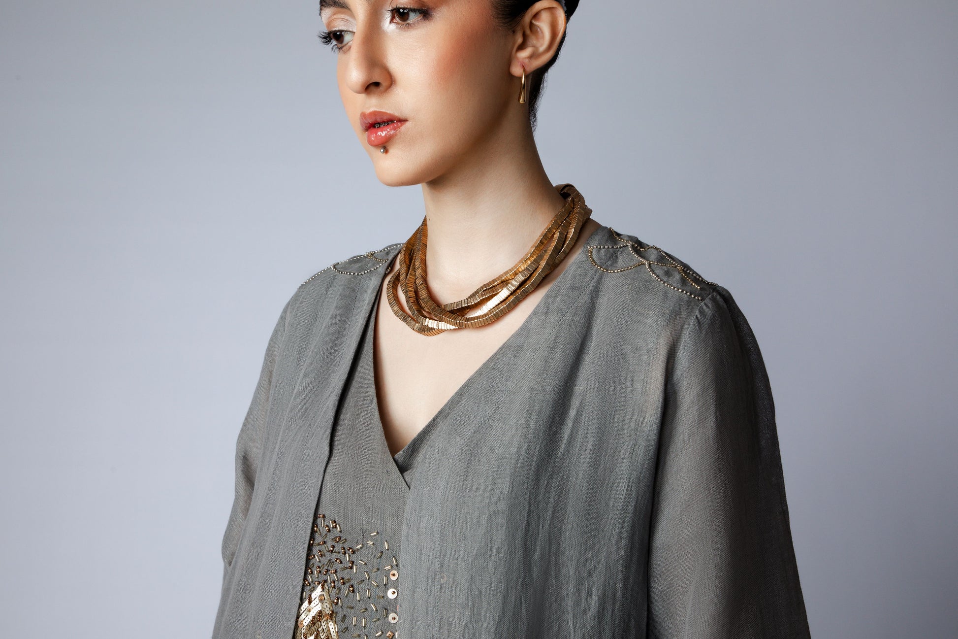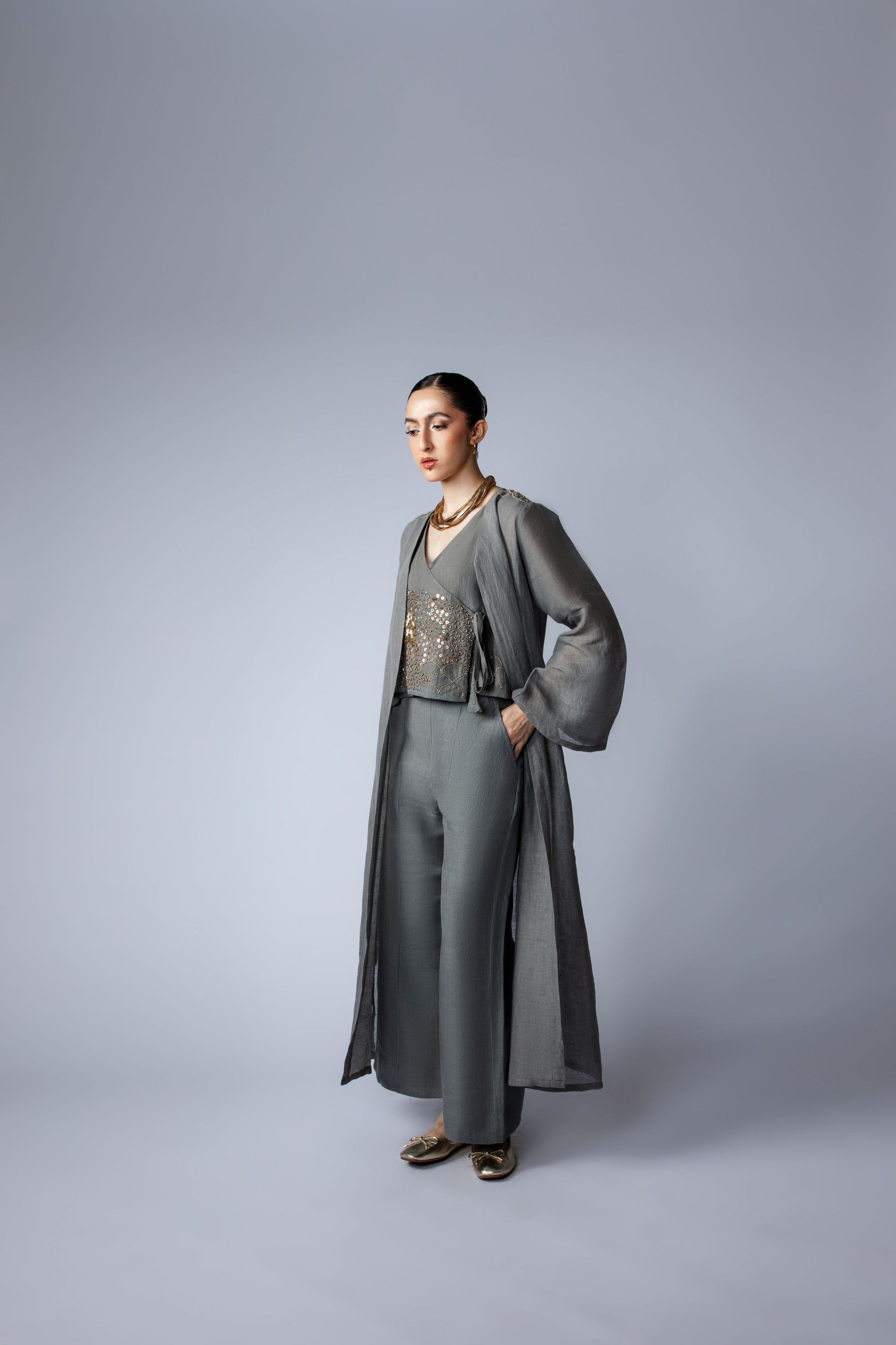 Feel effortless elegance in this soft-gray linen blend, designed to move with breath and ease. A single-panel wrap top features textured, metallic dot embroidery that catches the light without shouting. Paired with light weight floor length shrug and high-waisted, wide-leg pants that drapes you in a relaxed sophisticated way. Lightweight and breathable, it layers simplicity with standout detail. No extra fuss required. Wear it, love it, and keep your style straightforward and striking.