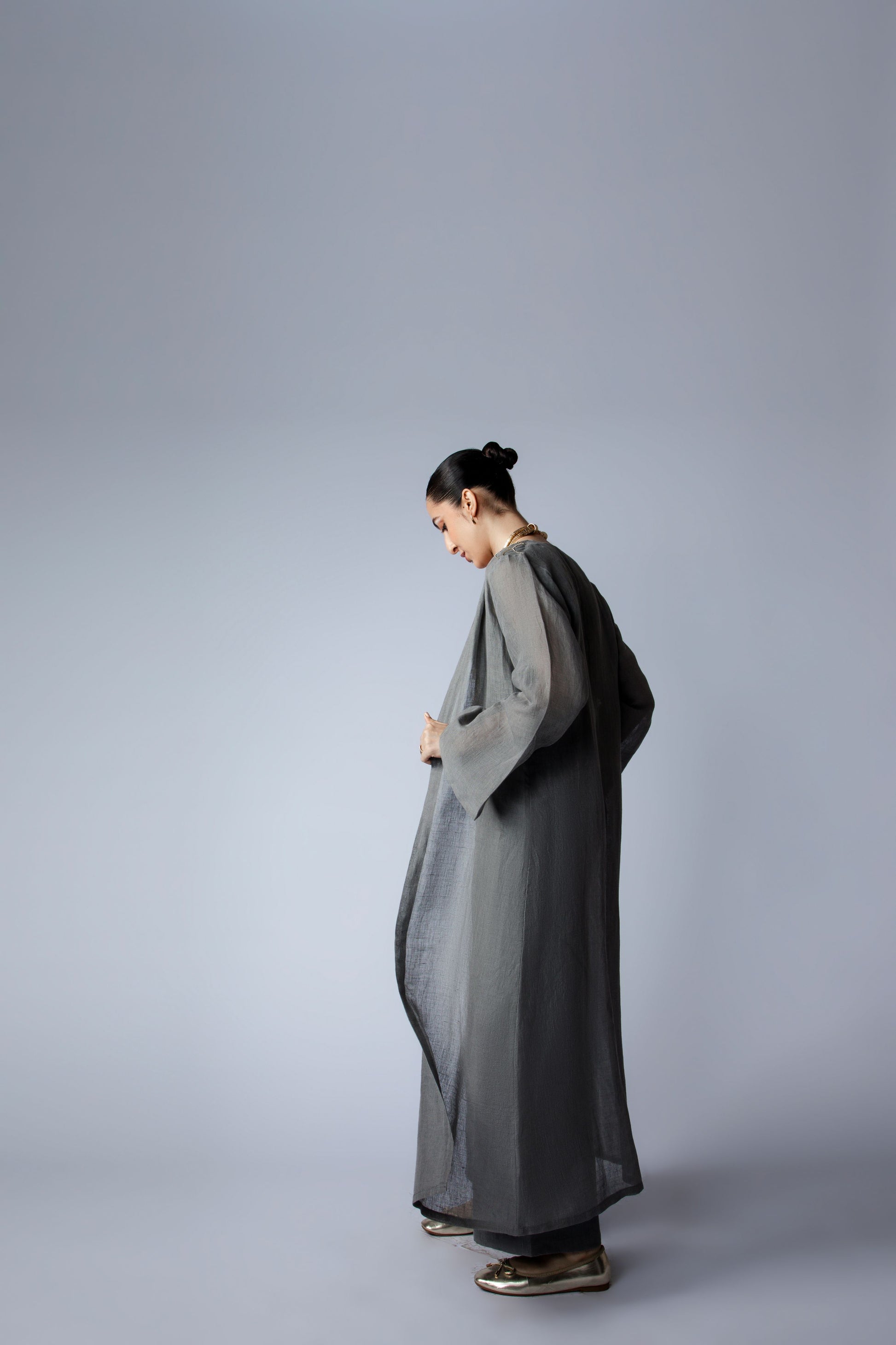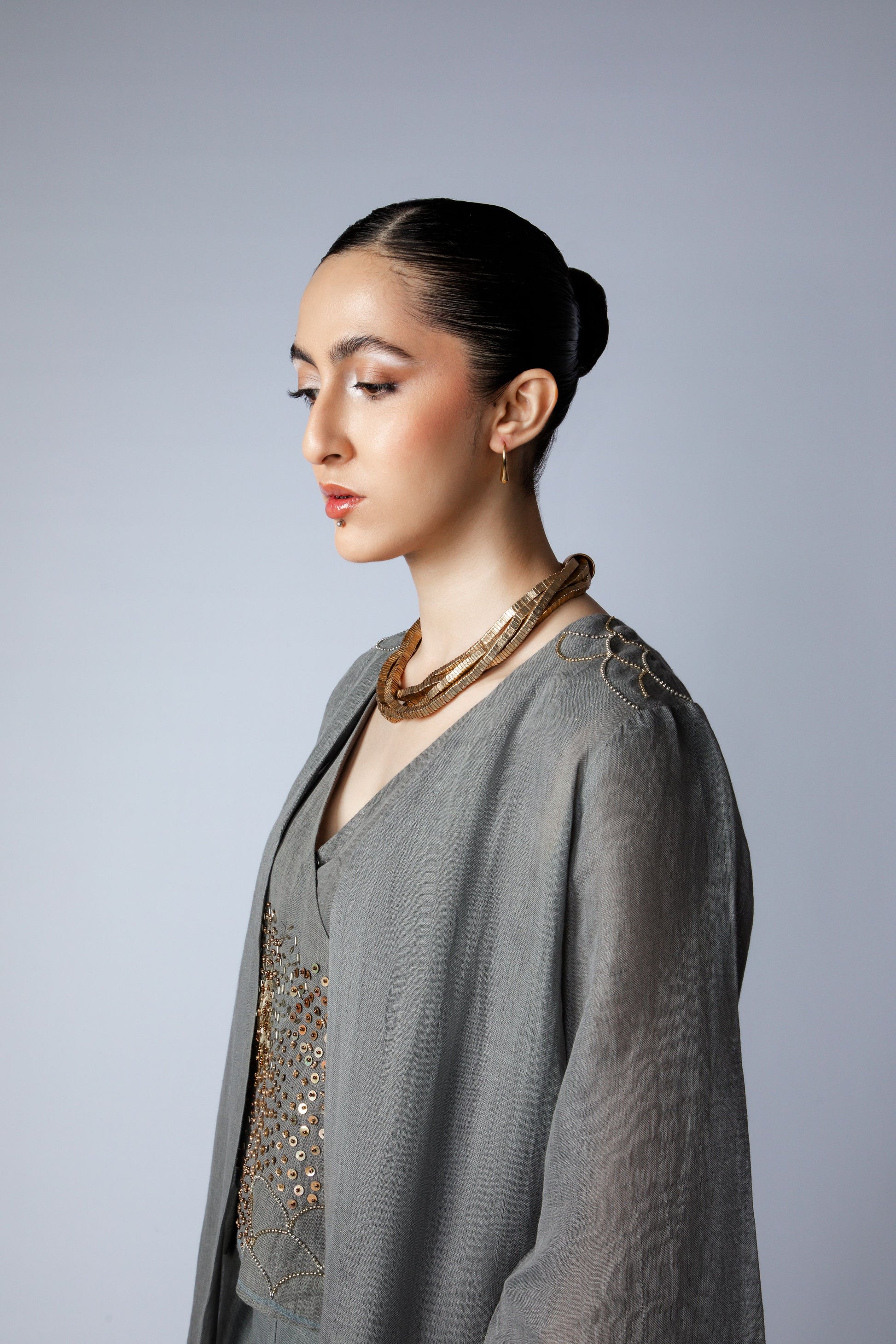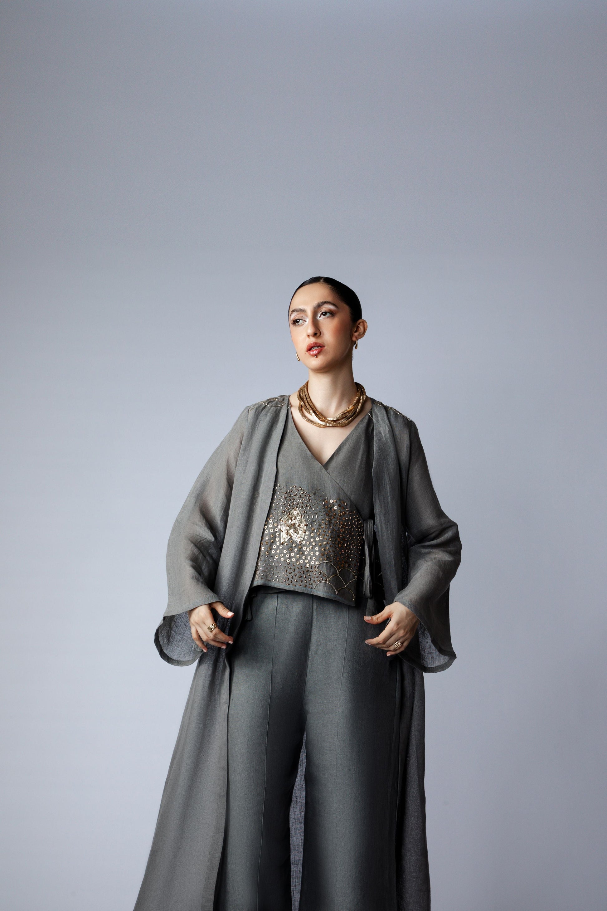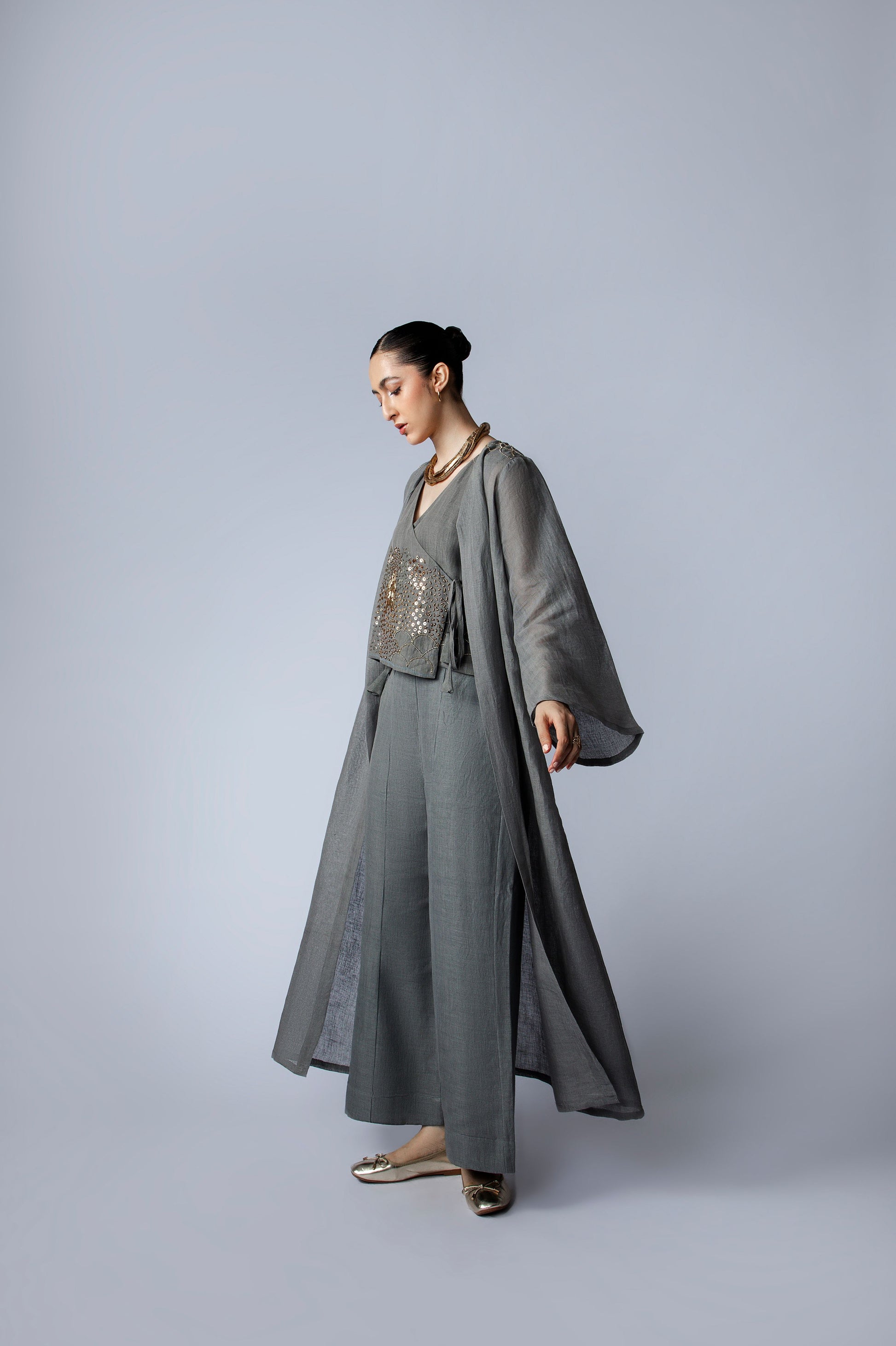Feel effortless elegance in this soft-gray linen blend, designed to move with breath and ease. A single-panel wrap top features textured, metallic dot embroidery that catches the light without shouting. Paired with light weight floor length shrug and high-waisted, wide-leg pants that drapes you in a relaxed sophisticated way. Lightweight and breathable, it layers simplicity with standout detail. No extra fuss required. Wear it, love it, and keep your style straightforward and striking.