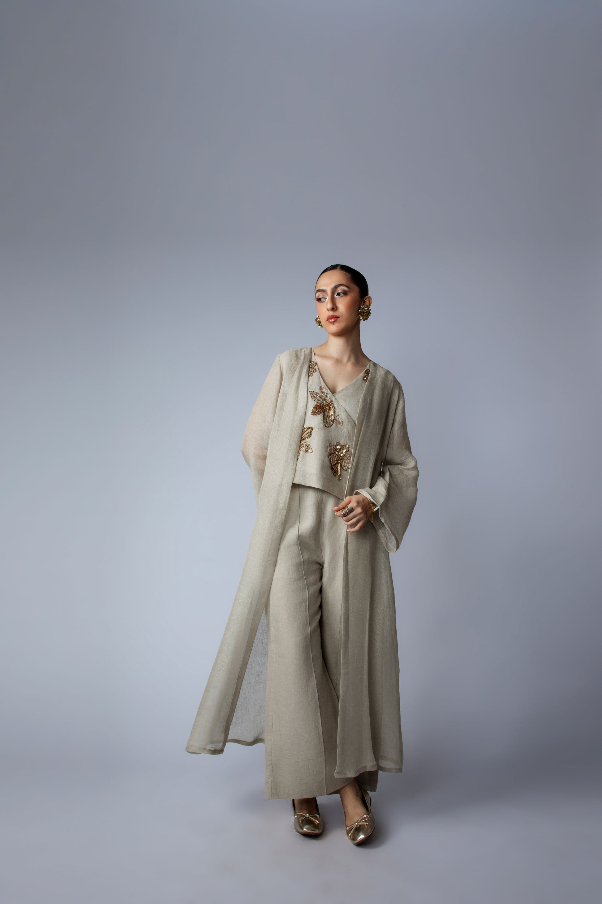 It’s a breezy linen-blend ensemble made to feel as good as it looks. The wrap-style top closes cleanly with subtle metallic floral appliqués that bring effortless elegance. High-waist, wide-leg trousers balance comfort with a slouchy sophistication and really let you move. Wear it from dawn-to-dinner, pairing it with sandals or your go-to statement earrings. Honest, light-care fabric that softens with time. No fuss, all class.