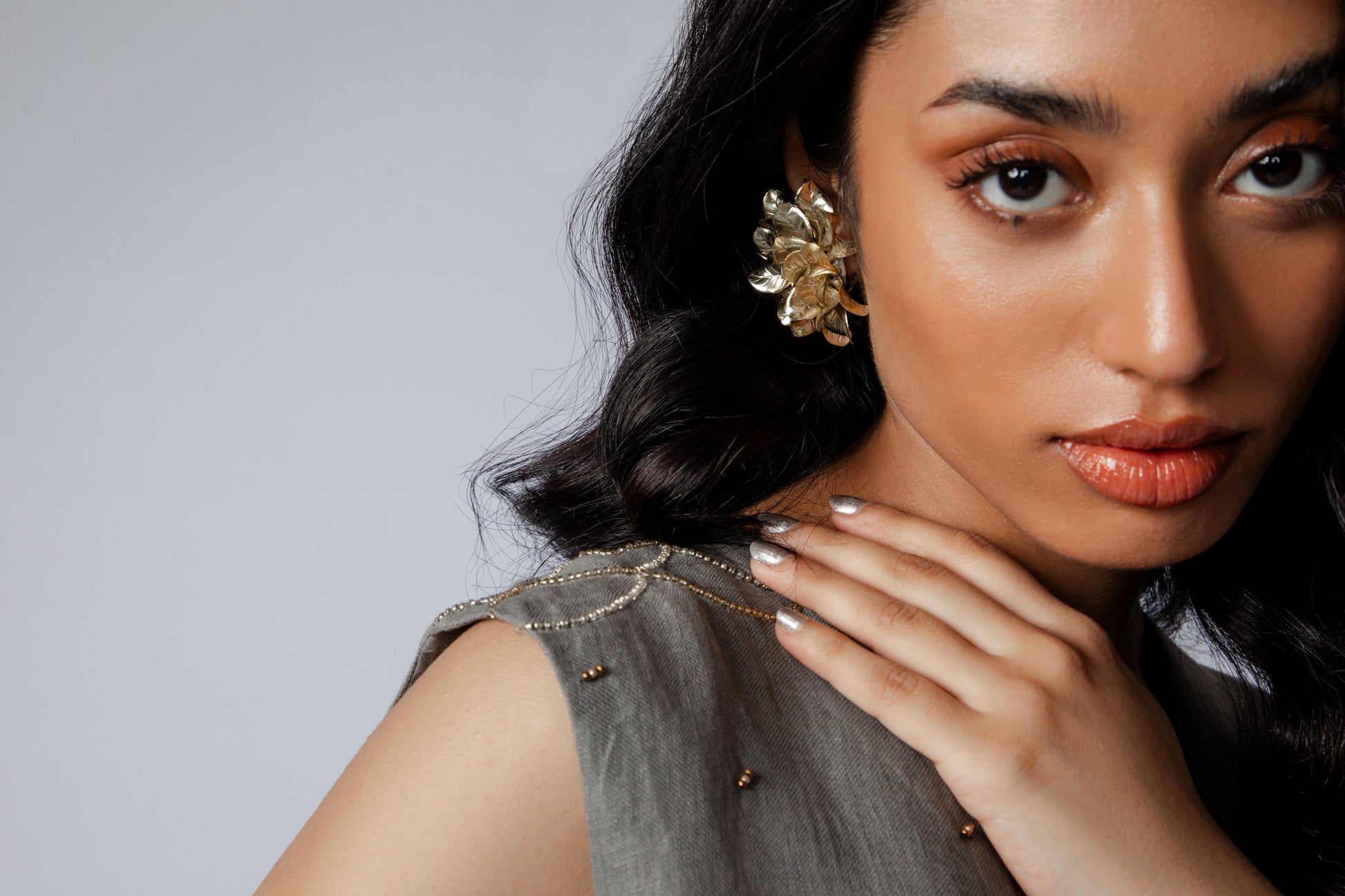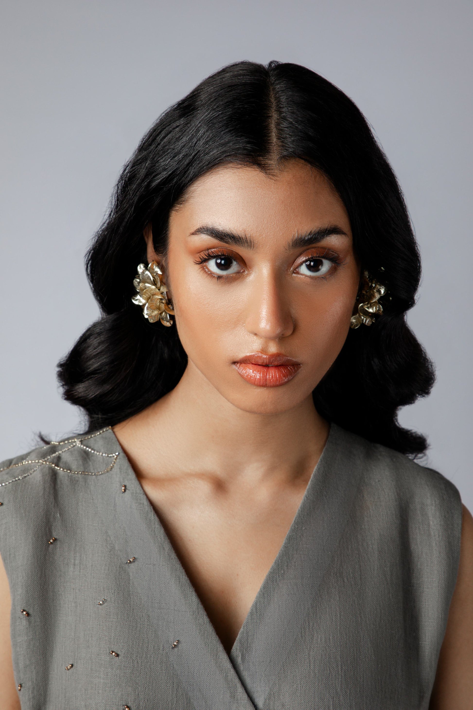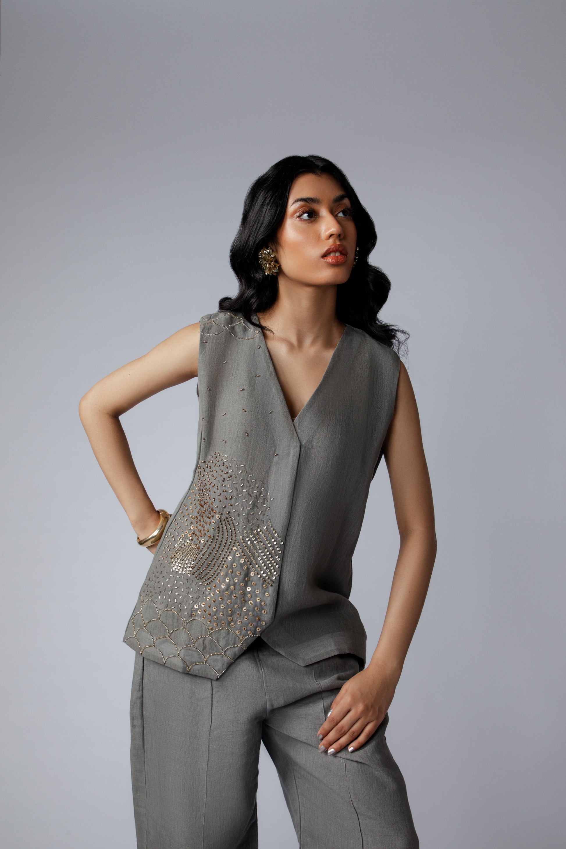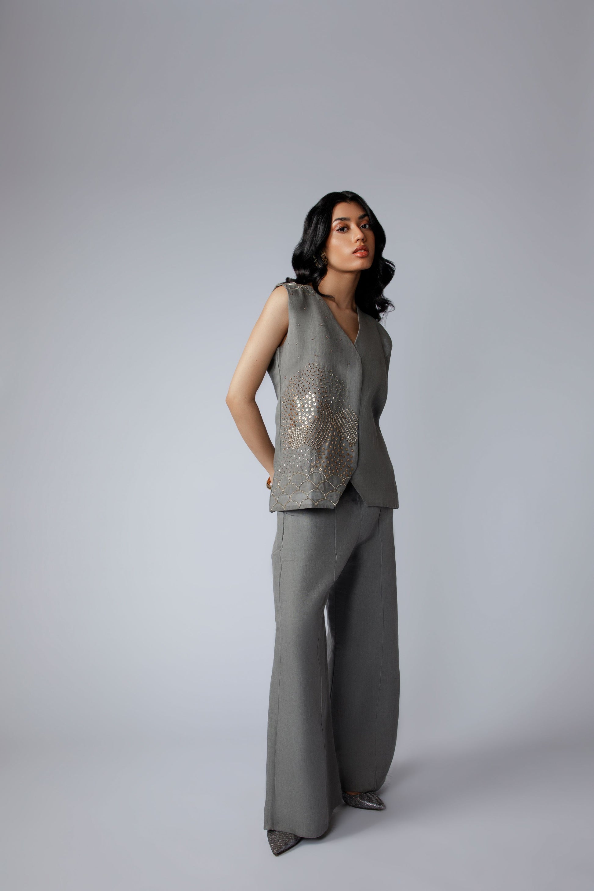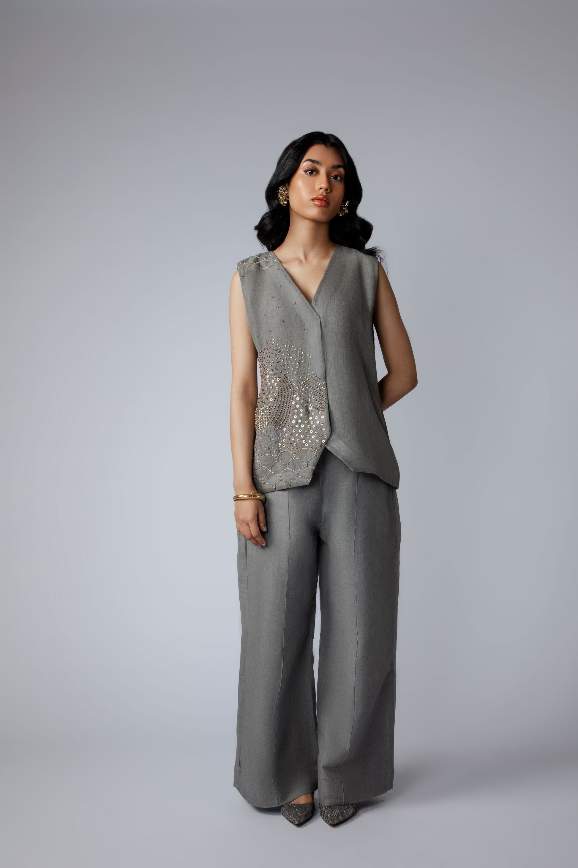 Feel effortless elegance in this soft-gray linen blend, designed to move with breath and ease. A double panel waist coat features textured, embellished with metallic dot hand embroidery that catches the light without shouting. Paired with high-waisted, wide-leg pants that drape in relaxed sophistication. Lightweight and breathable, it layers simplicity with standout detail. No extra fuss required. Wear it, love it, and keep your style straightforward and striking.