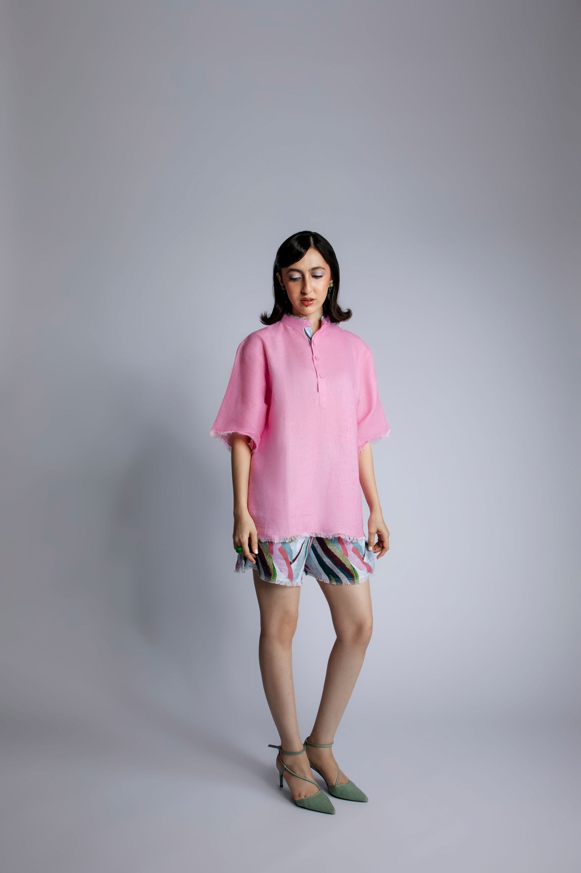 Understated on the outside, ocean energy within. This teal blue oversized linen shirt hides a hit of print along the inner placket and collar stand—brushstroke hues of deep blue, earthy green, coral, and muted gold. Bold but breathable, it’s a versatile top that works solo or as part of a set.