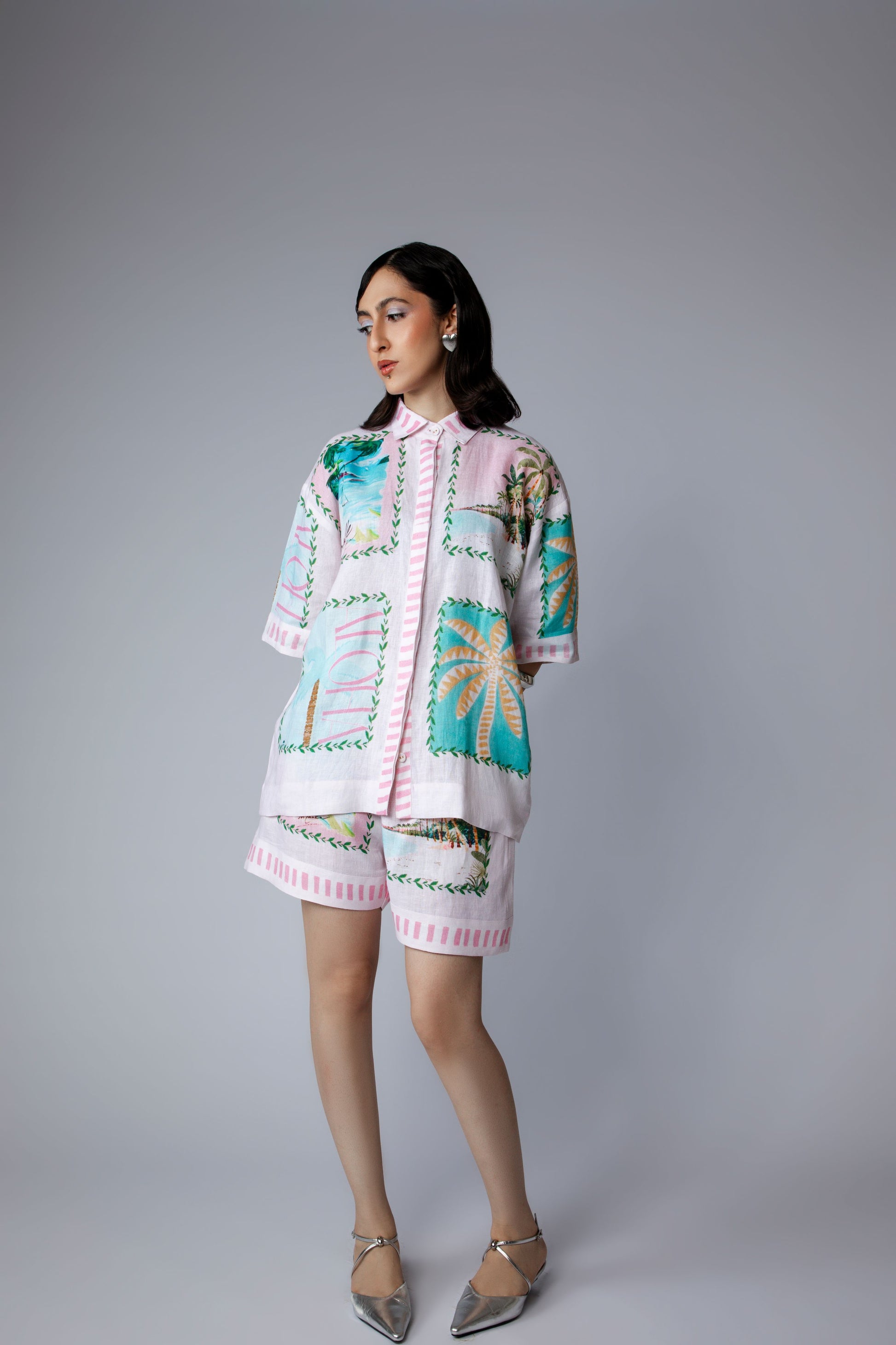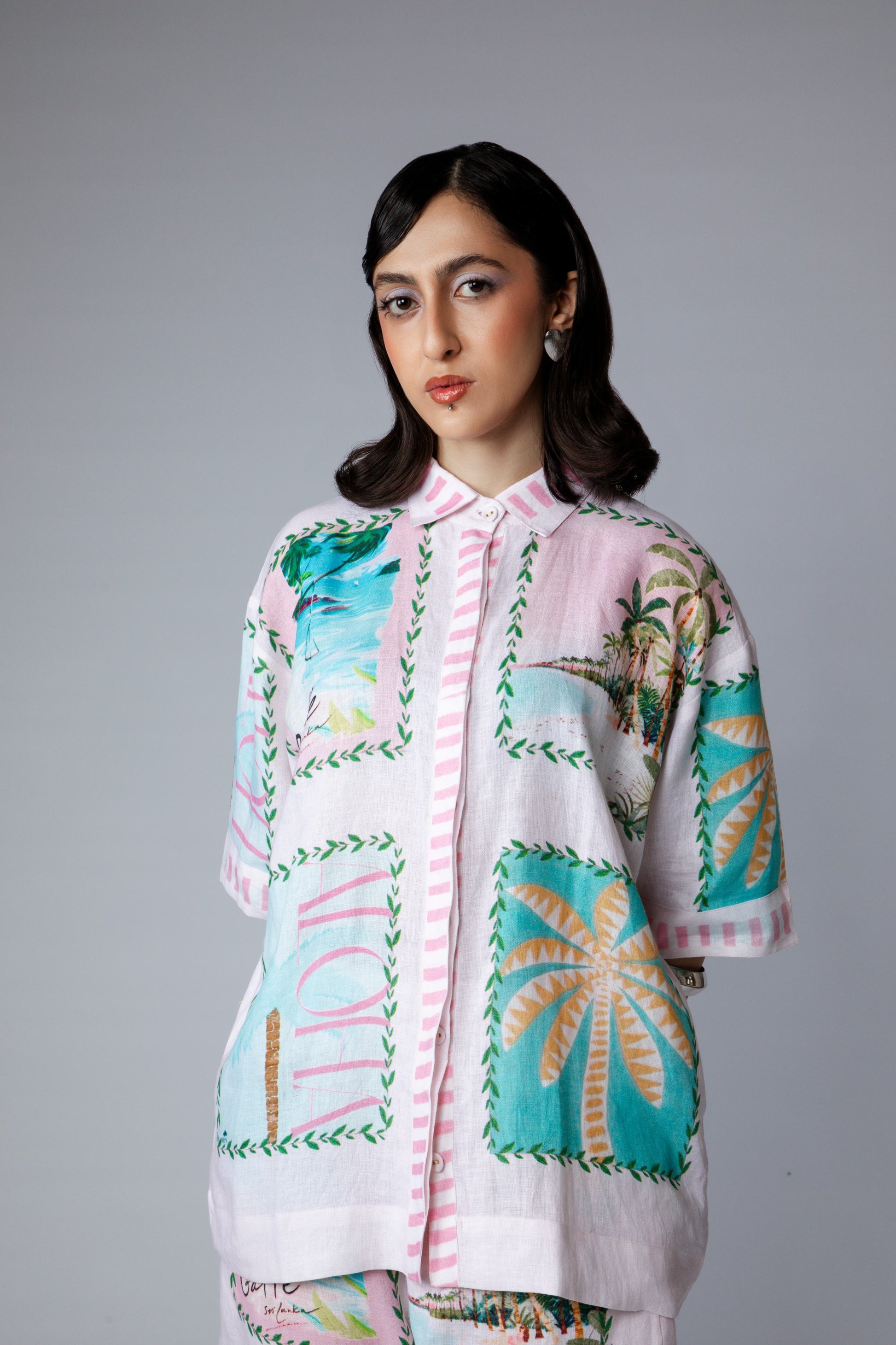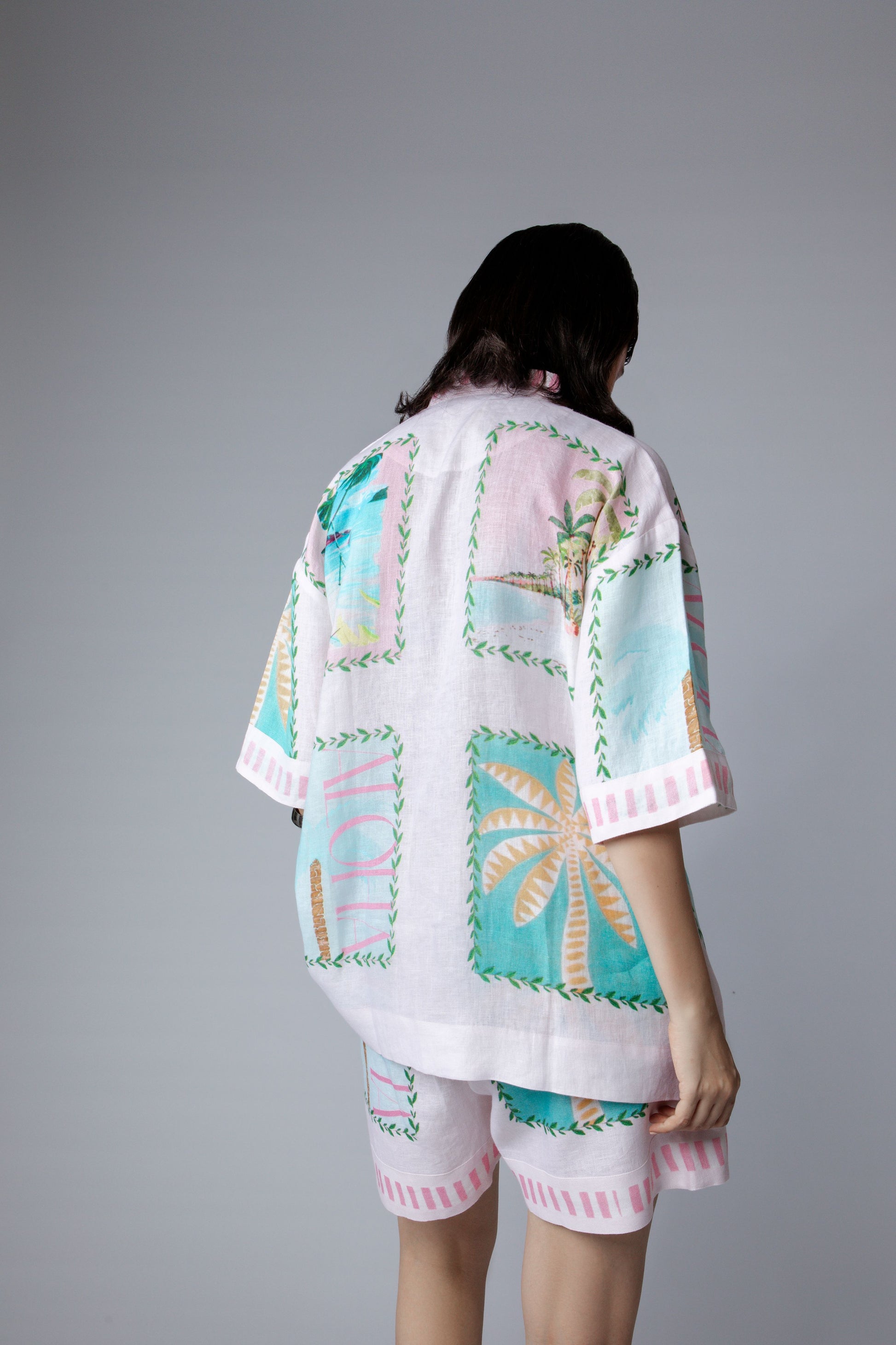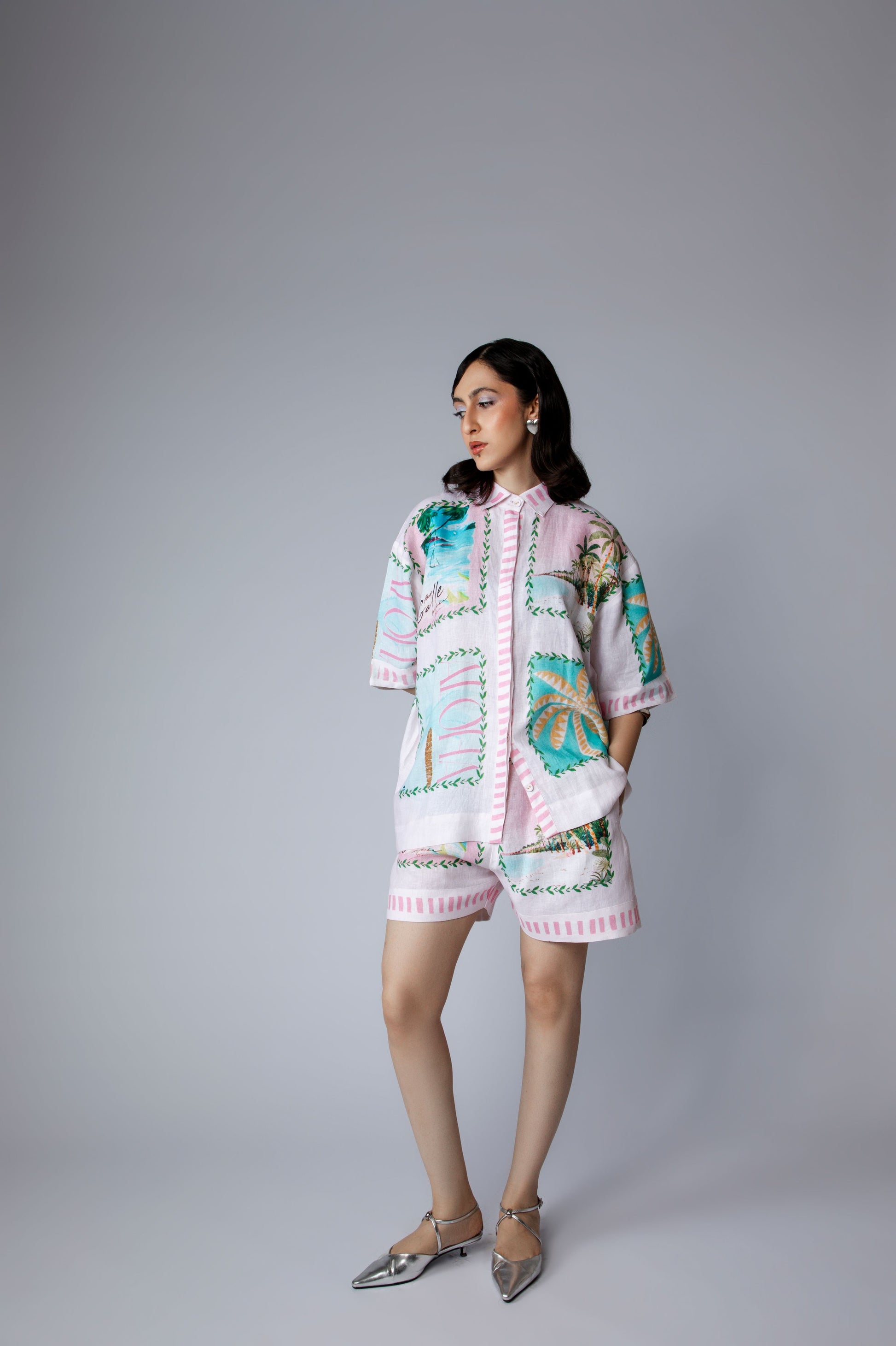 Bold Hawaiian florals are spliced into block panels, giving the classic vacation print a modern, edgy twist. The play of color feels vibrant yet intentional. Each block a burst of paradise stitched into breathable linen.Cut for comfort with a relaxed fit, they move as easily through a beach brunch as they do on a night out. Pair them with a crisp shirt for contrast, or double down with a matching top to go full tropical takeover.