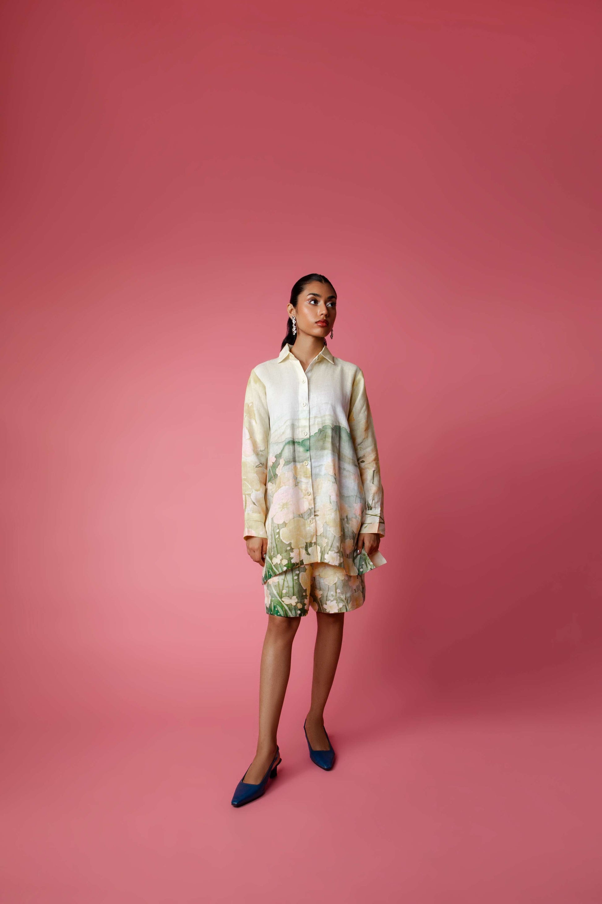 Re imagination of the beautiful sunlight skies with mountains and late spring in its bloom. The ombre sets the mood for fun, relaxed and I have arrived vibe. Wear the set for best impact or separate to make it look fresh every time.