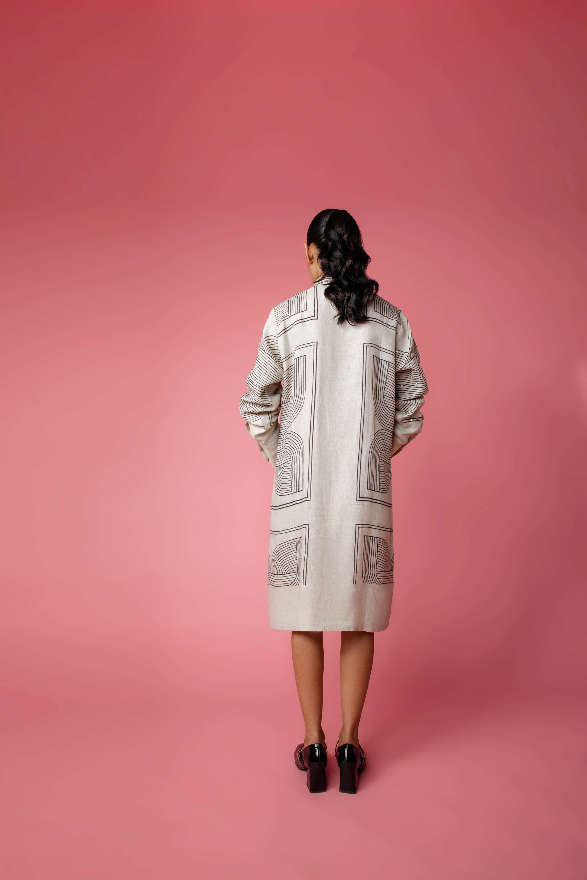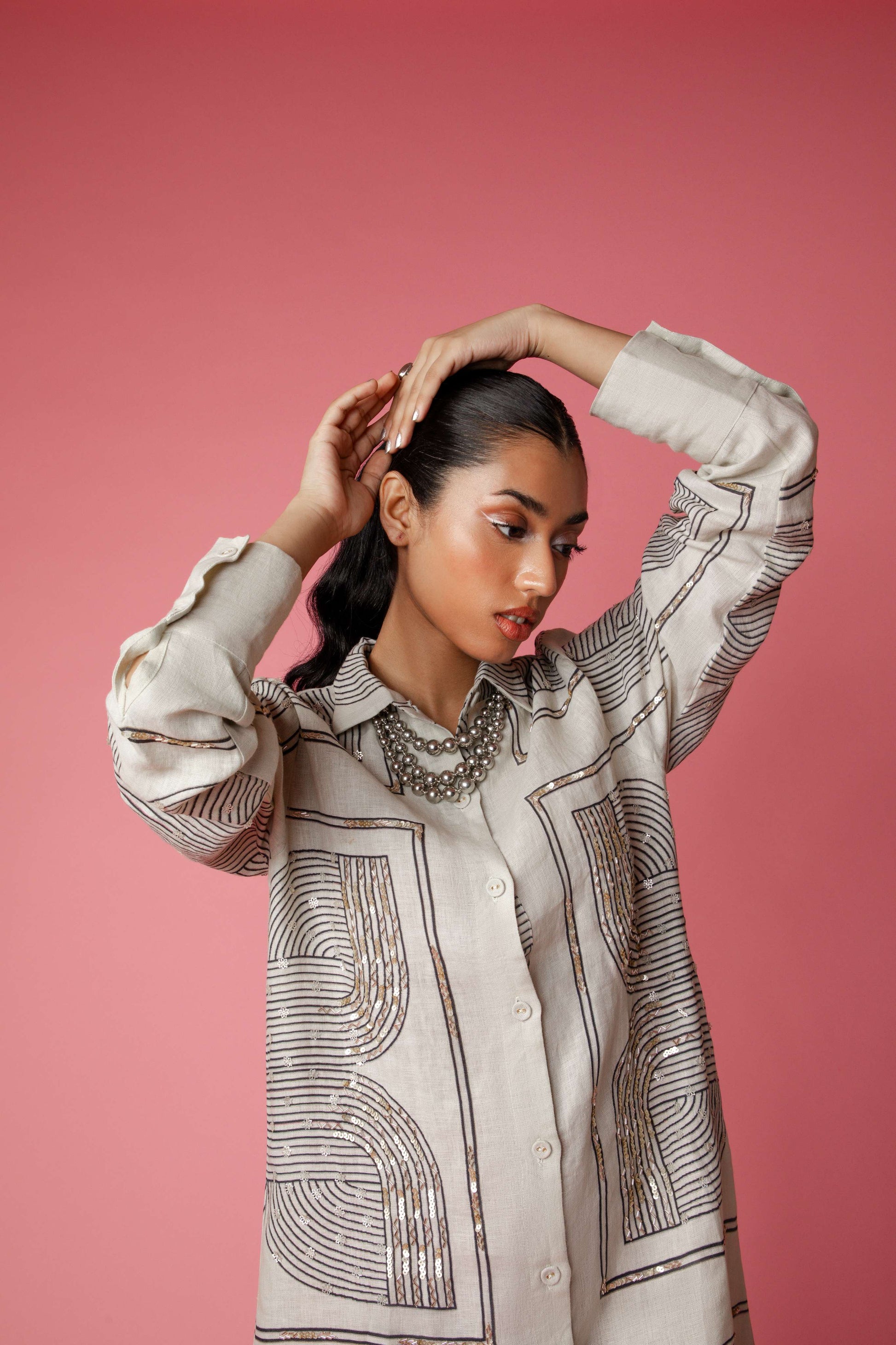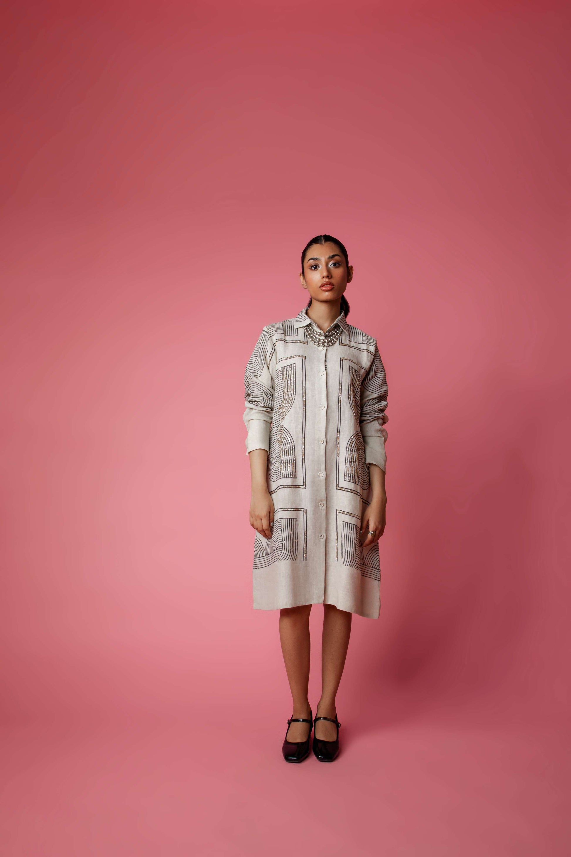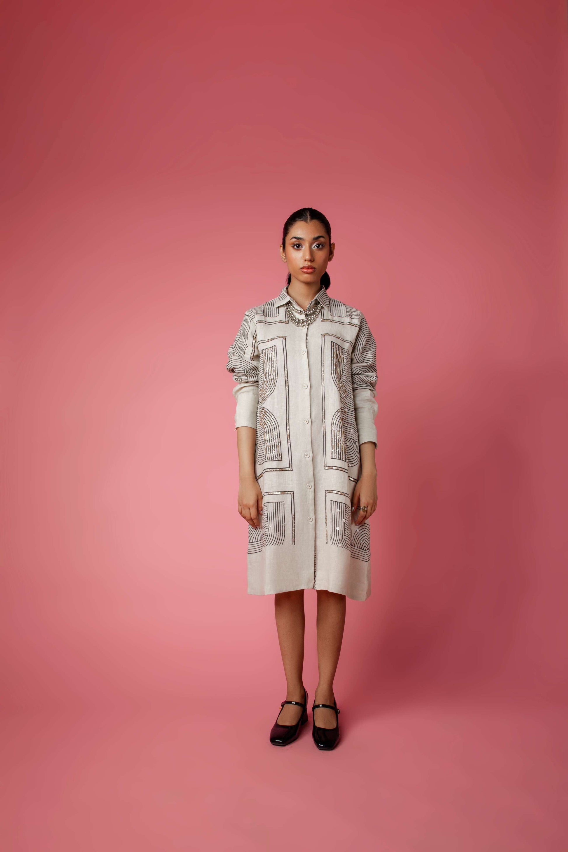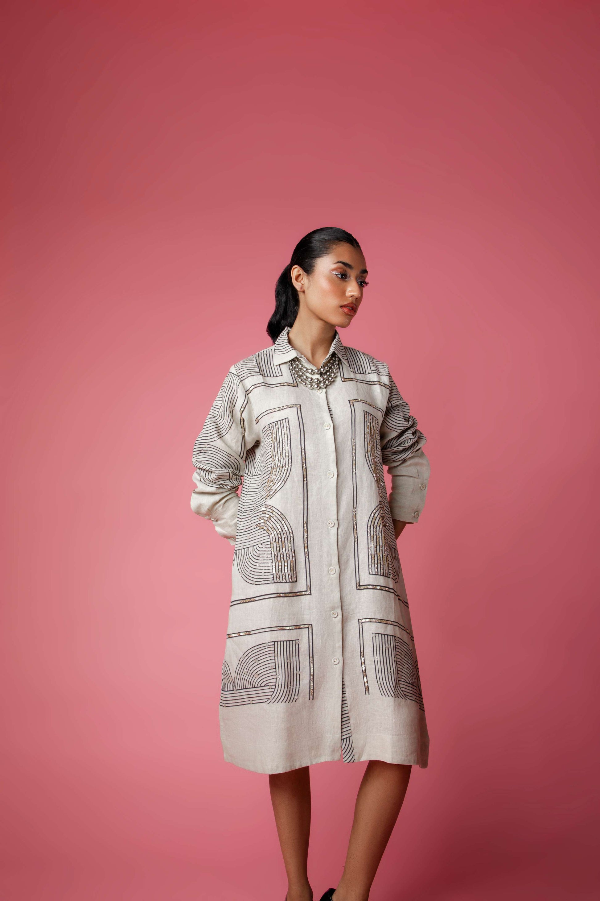 Chic without trying too hard. This sage green full-sleeve, knee length shirt dress in pure linen plays it cool with clean lines and bold geometric embroidery. The sequin detailing gives it just the right touch of shine without screaming for attention. Button it up with boots for winter layering or leave it loose with slides on mellow days. It’s the kind of dress that doesn’t follow trends, it sets them.