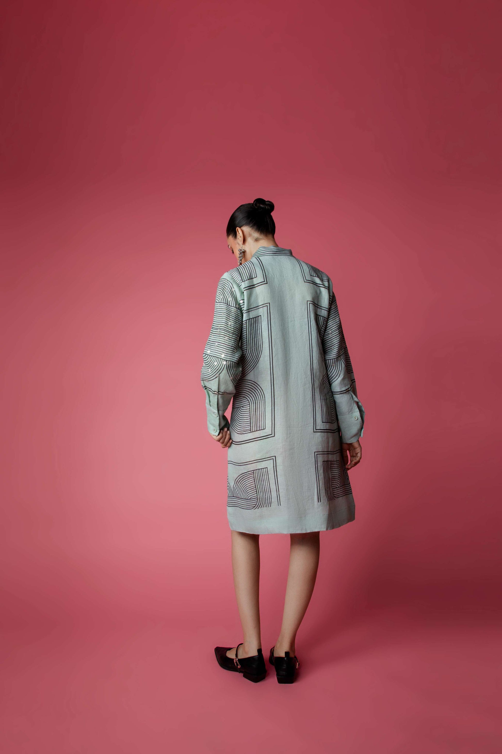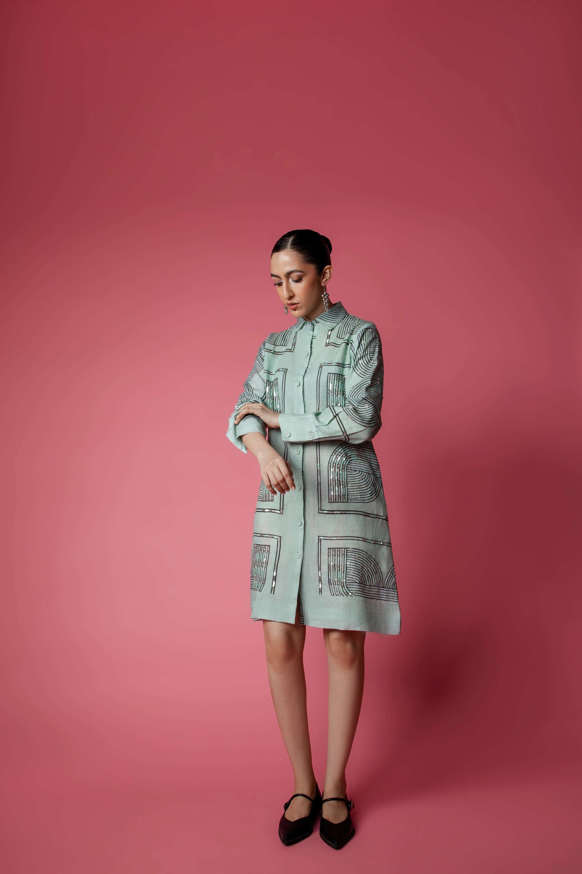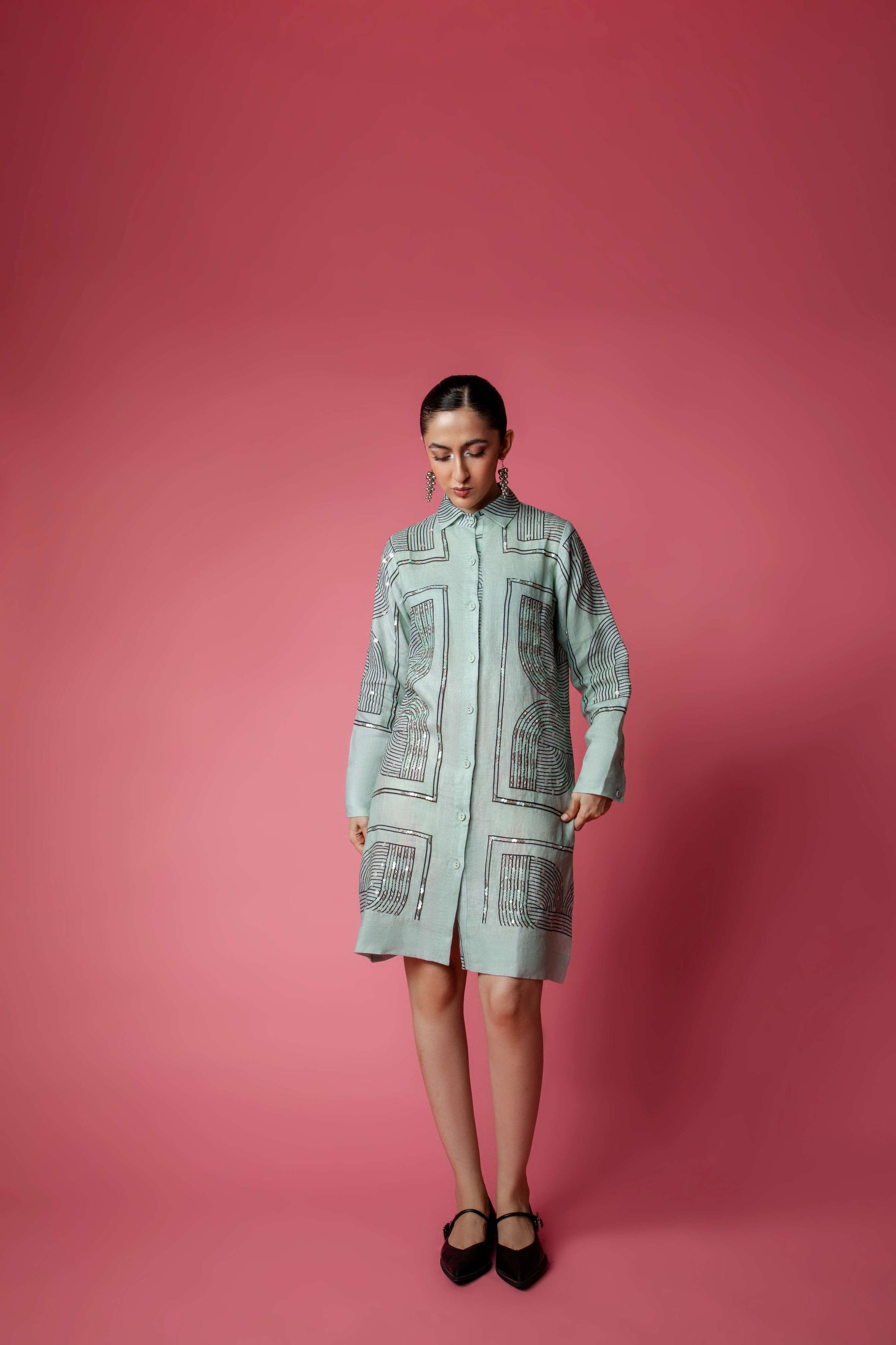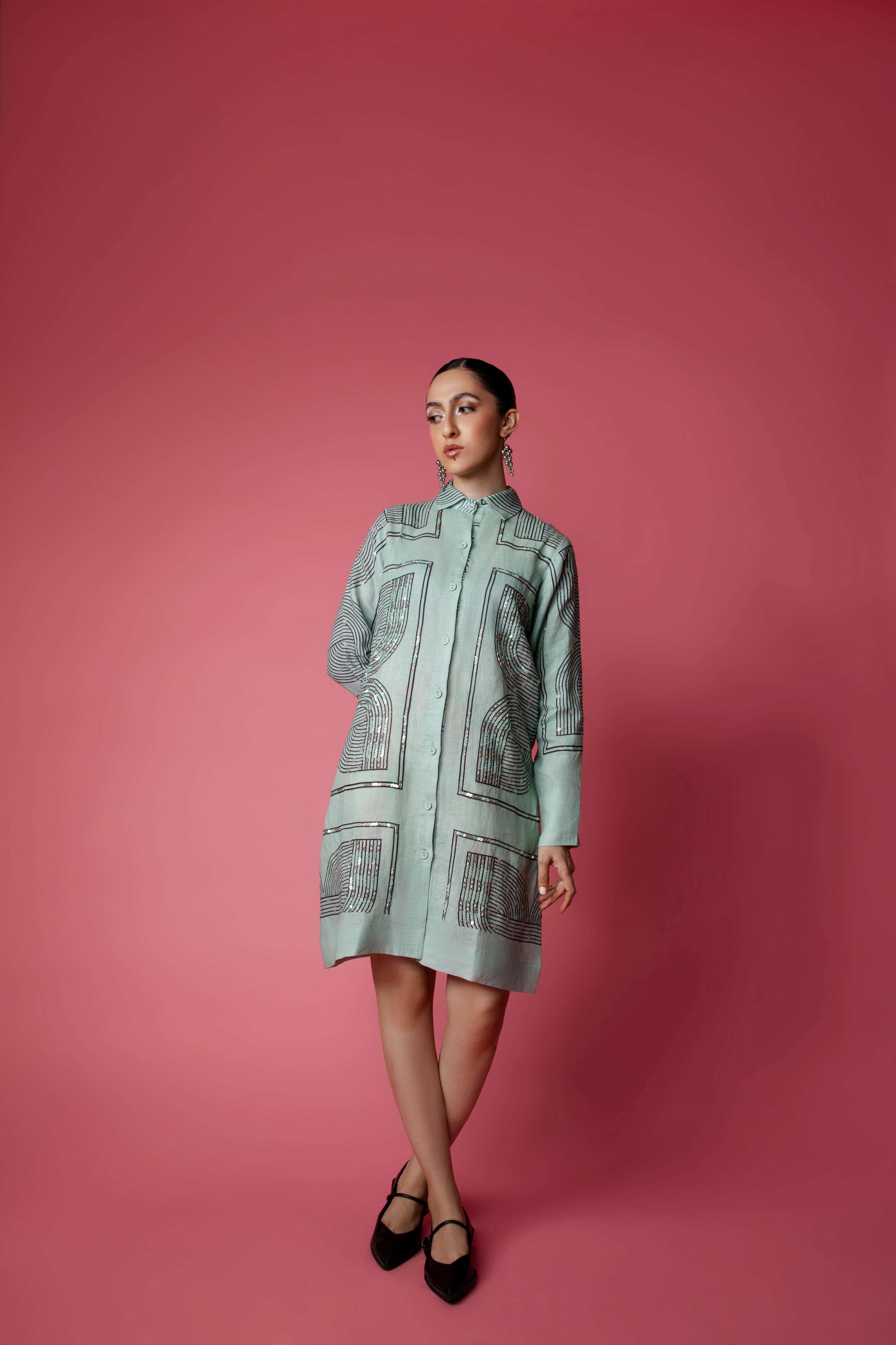 Chic without trying too hard. This sage green full-sleeve, knee length shirt dress in pure linen plays it cool with clean lines and bold geometric embroidery. The sequin detailing gives it just the right touch of shine without screaming for attention. Button it up with boots for winter layering or leave it loose with slides on mellow days. It’s the kind of dress that doesn’t follow trends, it sets them.