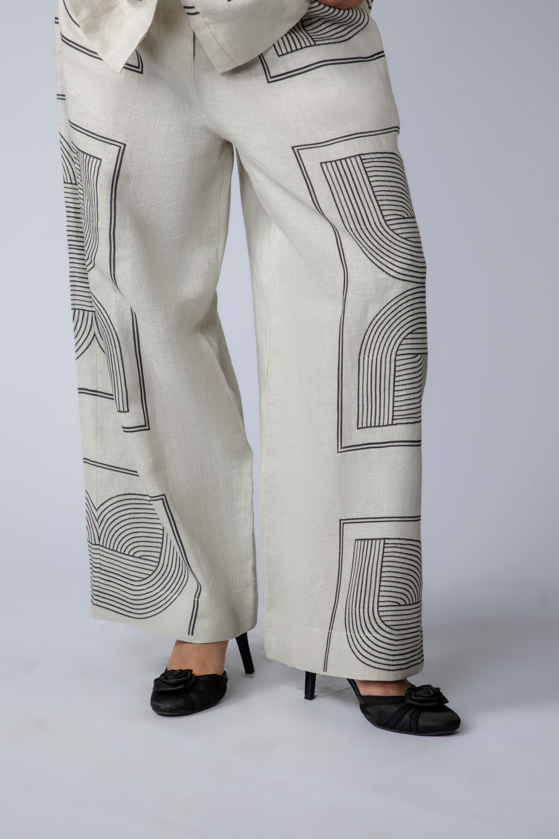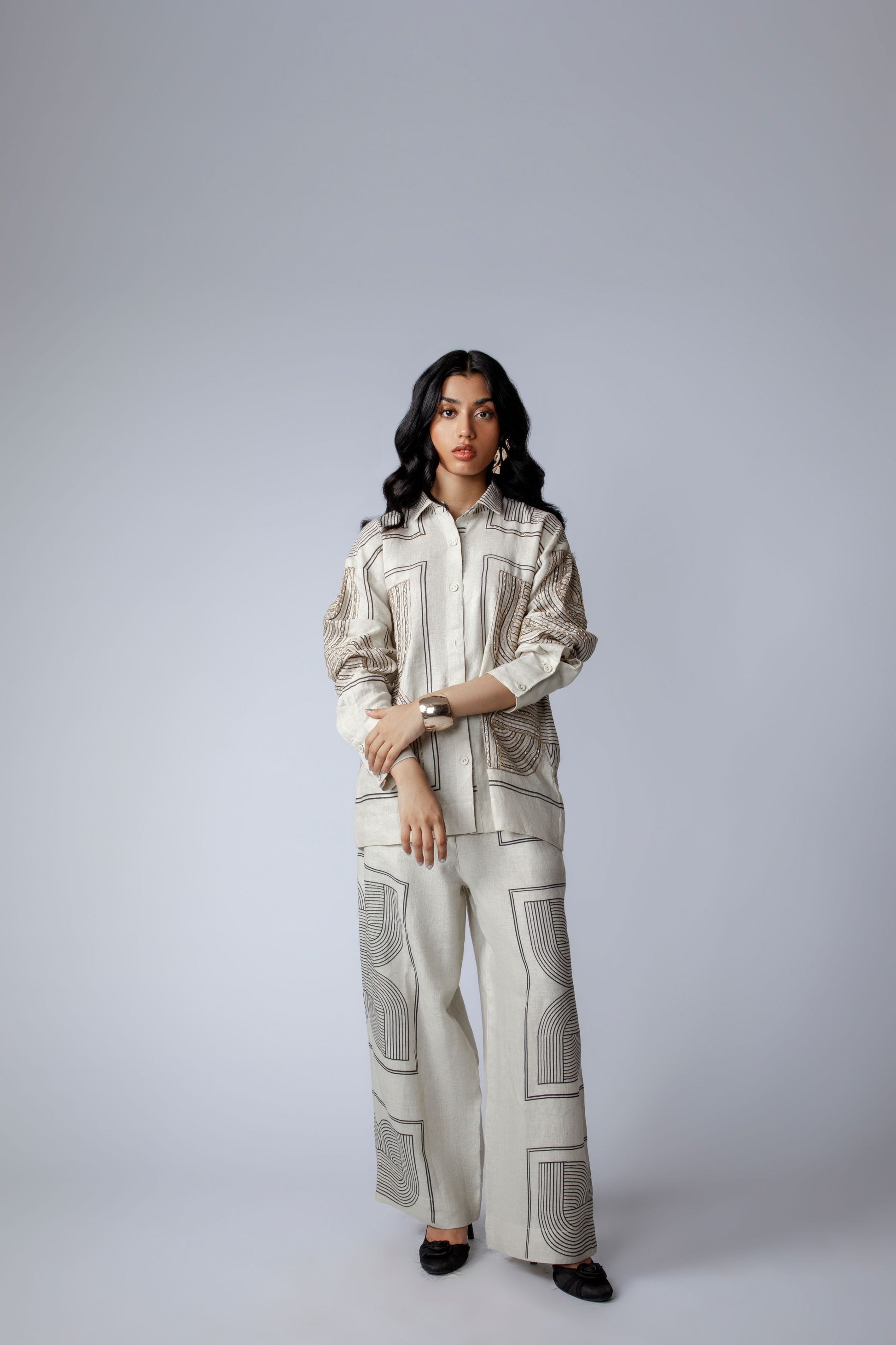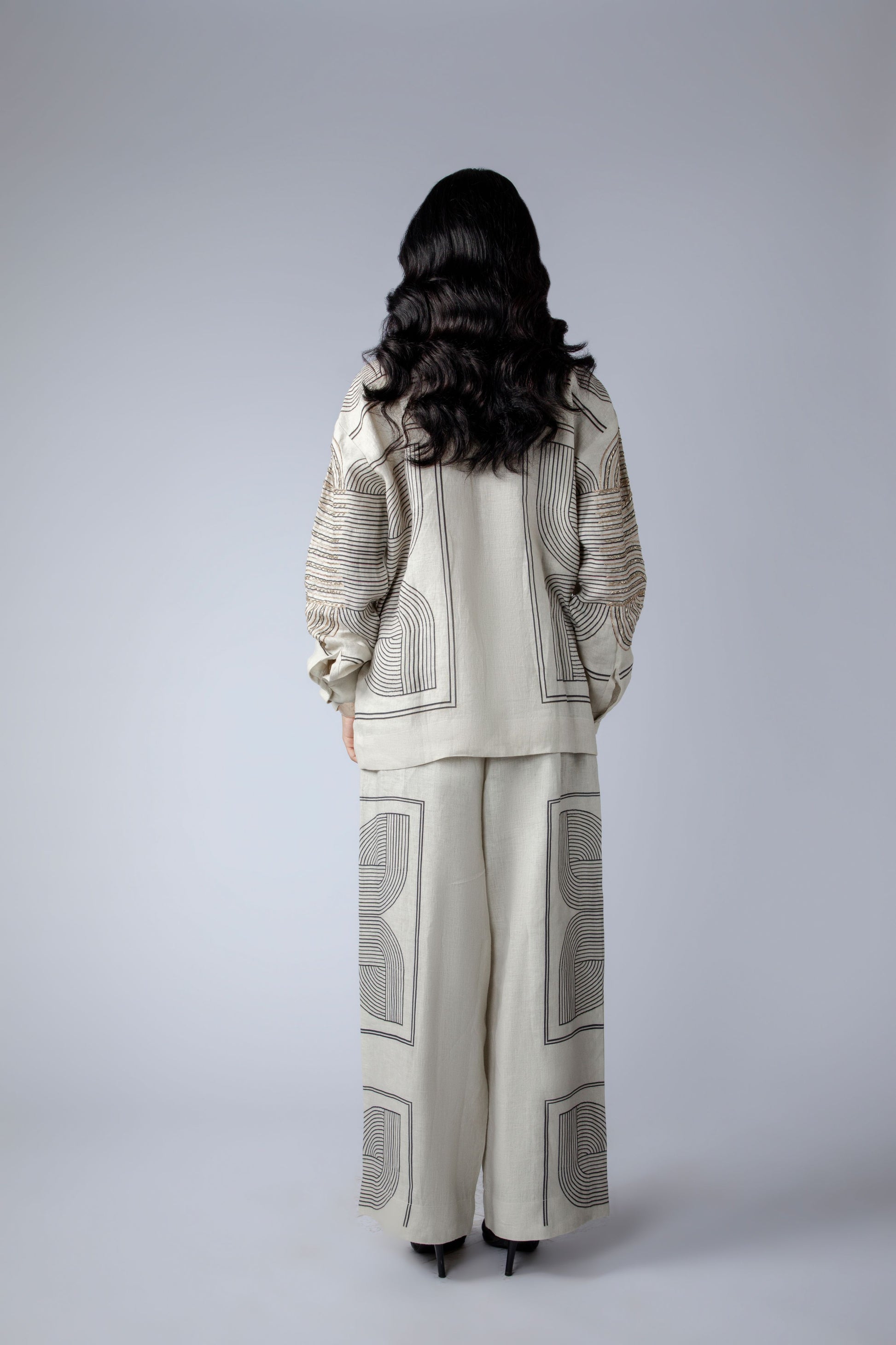 Smart, sassy, and stitched to stun. This Beige 100 percent linen cord set is embroidered with graphic geometric drama, lined with embellishments that catch the light and conversations. The shirt features a structured collar and long sleeves for that “I’m polished, but fun” look, while the matching flare pants make it brunch-to-boardroom ready. wear the shirt open with a eye catching gold, black or white tank. Chunky earrings, nude heels, or even sneakers if you’re feeling cheeky. Made for the cool breeze of winter days and warmer stares
