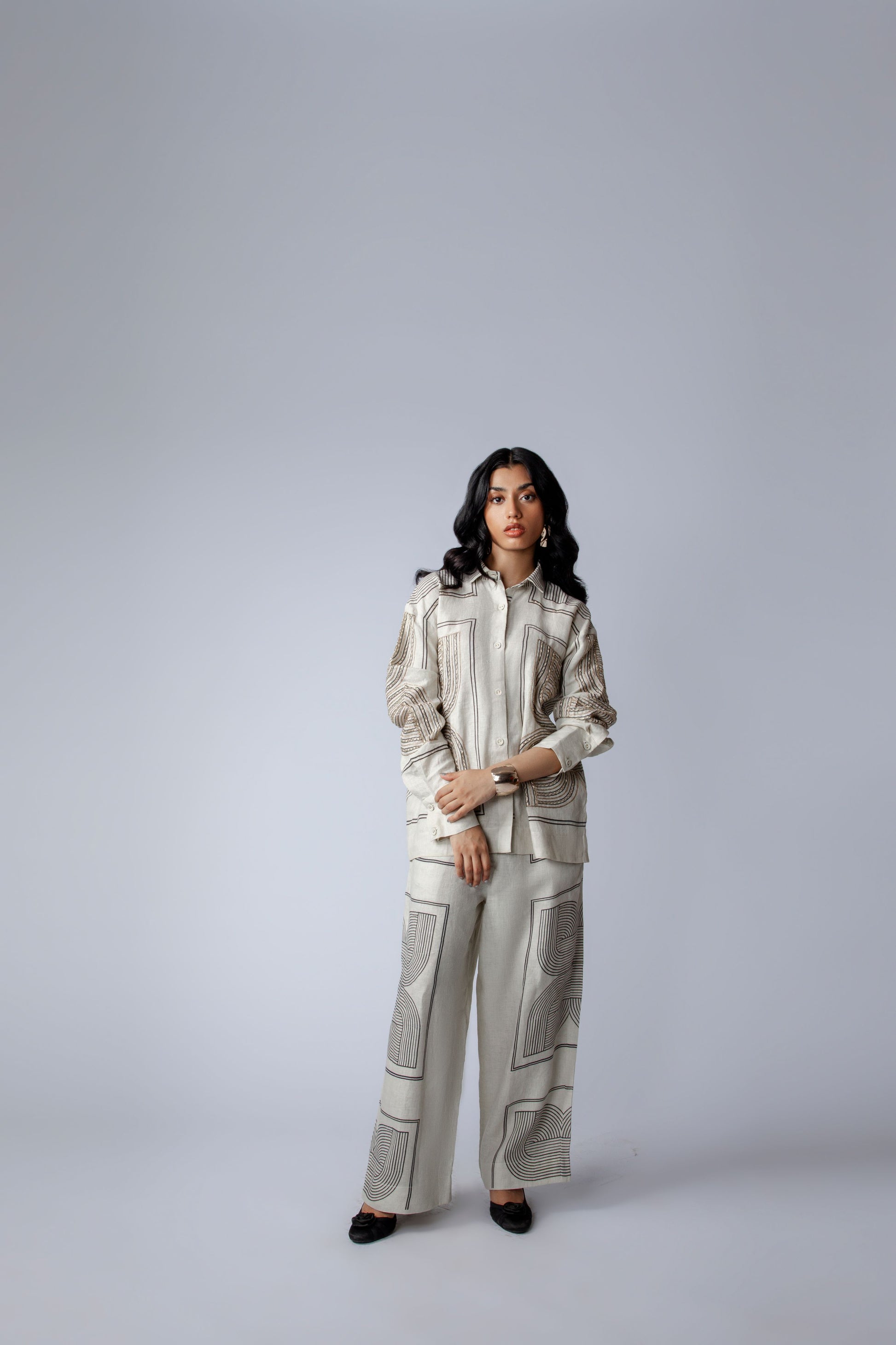 Smart, sassy, and stitched to stun. This Beige 100 percent linen cord set is embroidered with graphic geometric drama, lined with embellishments that catch the light and conversations. The shirt features a structured collar and long sleeves for that “I’m polished, but fun” look, while the matching flare pants make it brunch-to-boardroom ready. wear the shirt open with a eye catching gold, black or white tank. Chunky earrings, nude heels, or even sneakers if you’re feeling cheeky. Made for the cool breeze of winter days and warmer stares