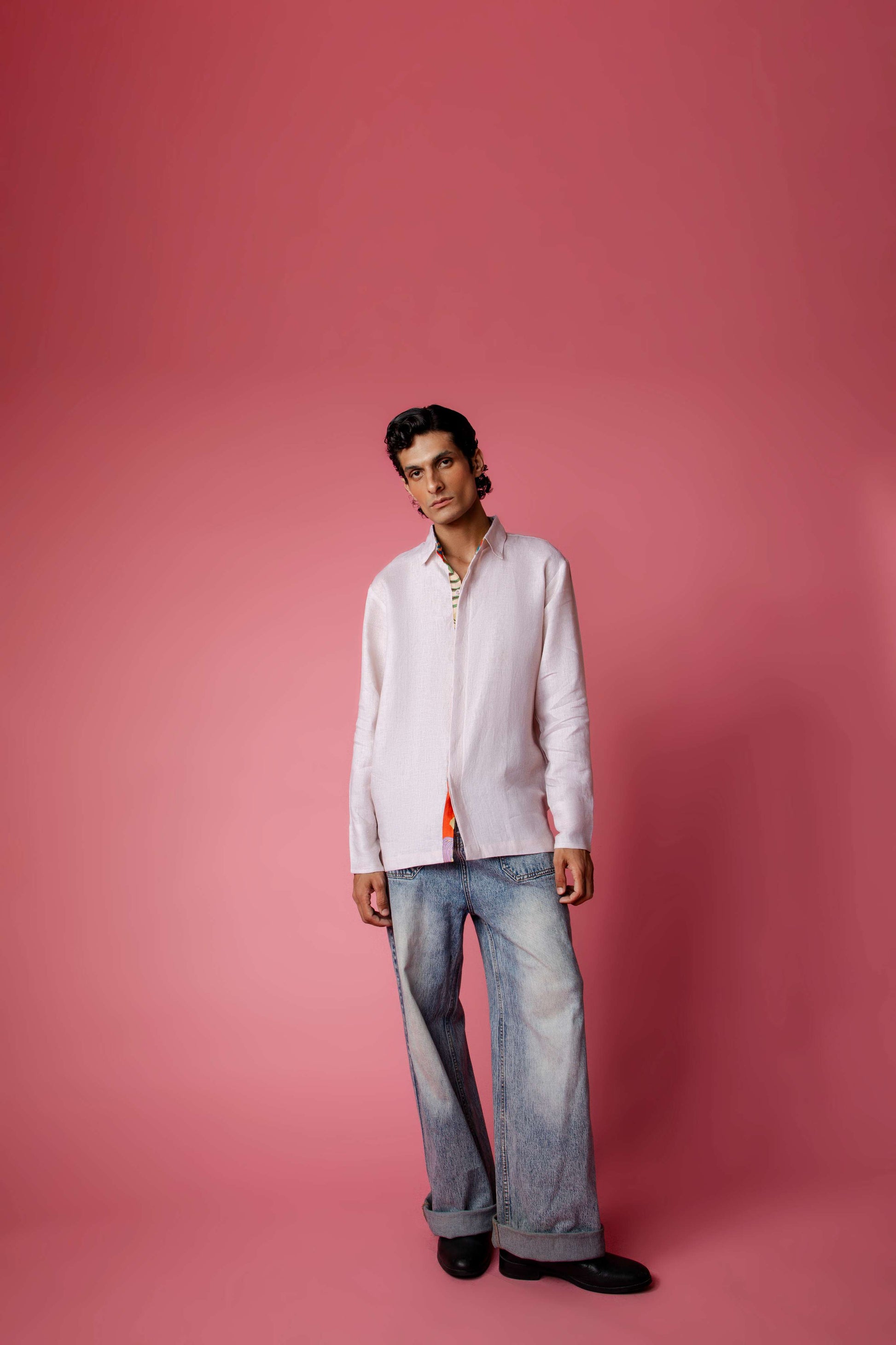Clean in the front, statement in the back. This light beige full-sleeve linen shirt flips the script with a bold patchwork panel and distressed colorful fish patchwork. The inner placket and sleeve folds reveal flashes of the Tropical Swarm print, adding a playful twist. Collared, casual, oversized. This one’s stitched with personality for days when basic won’t cut it.
