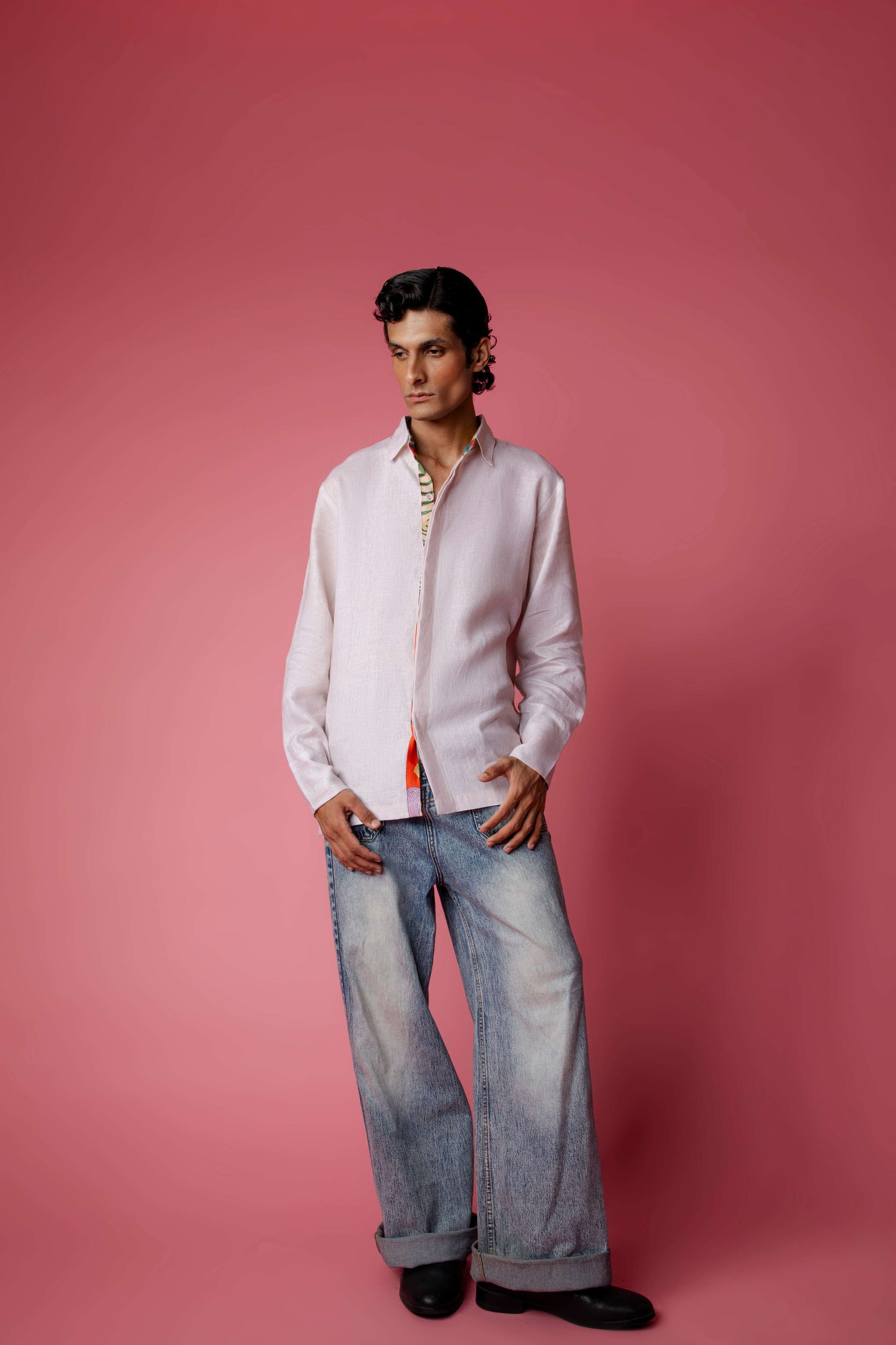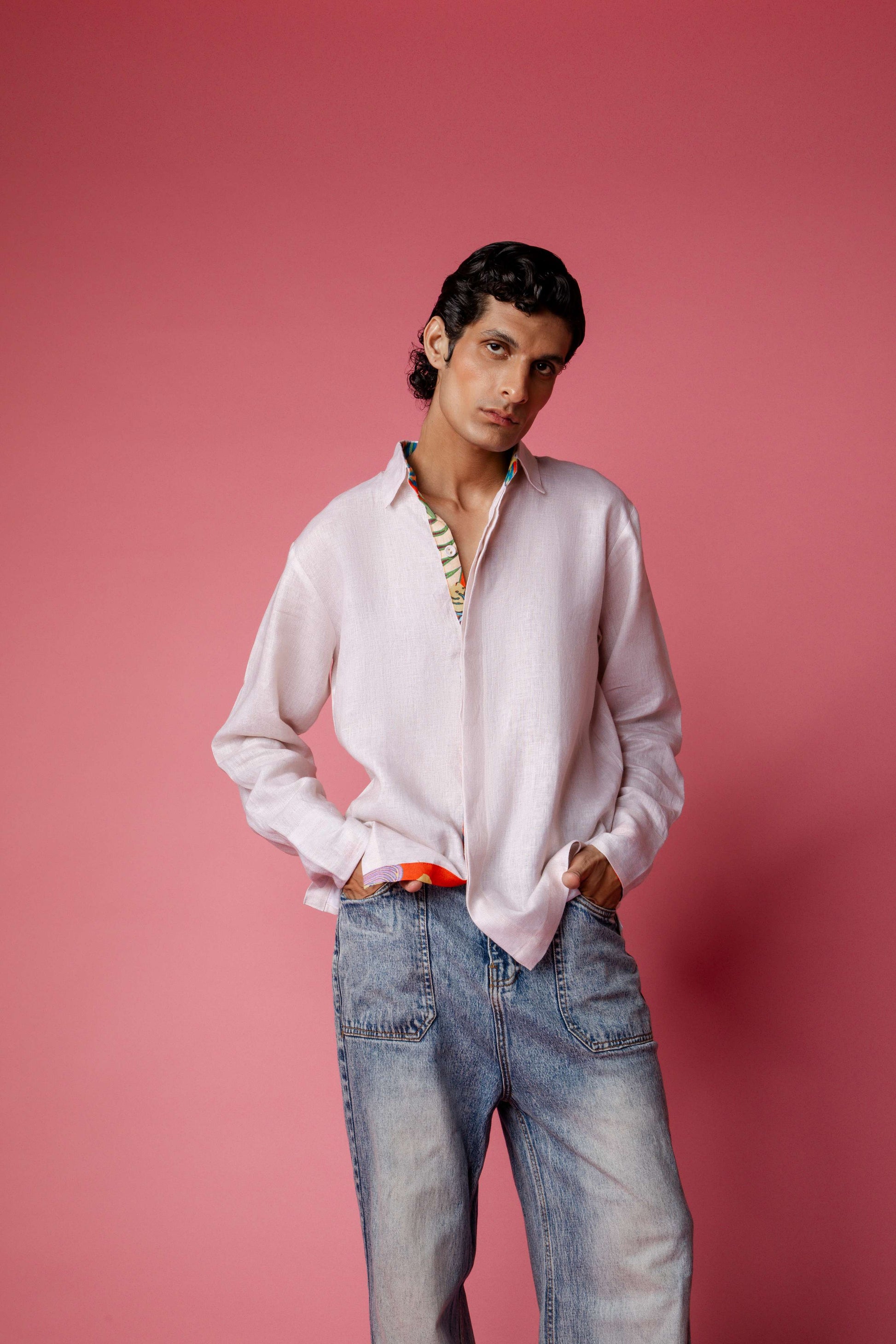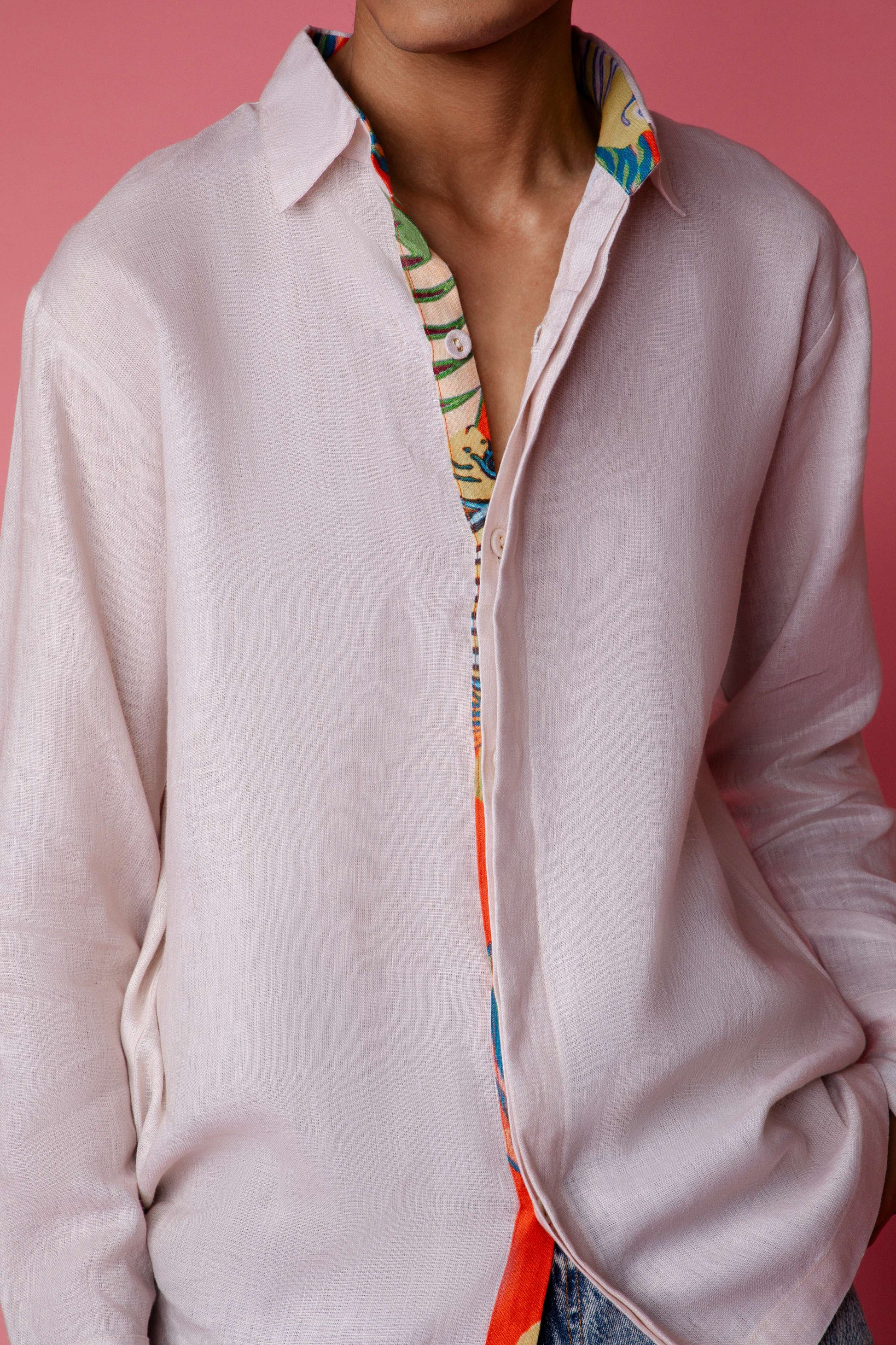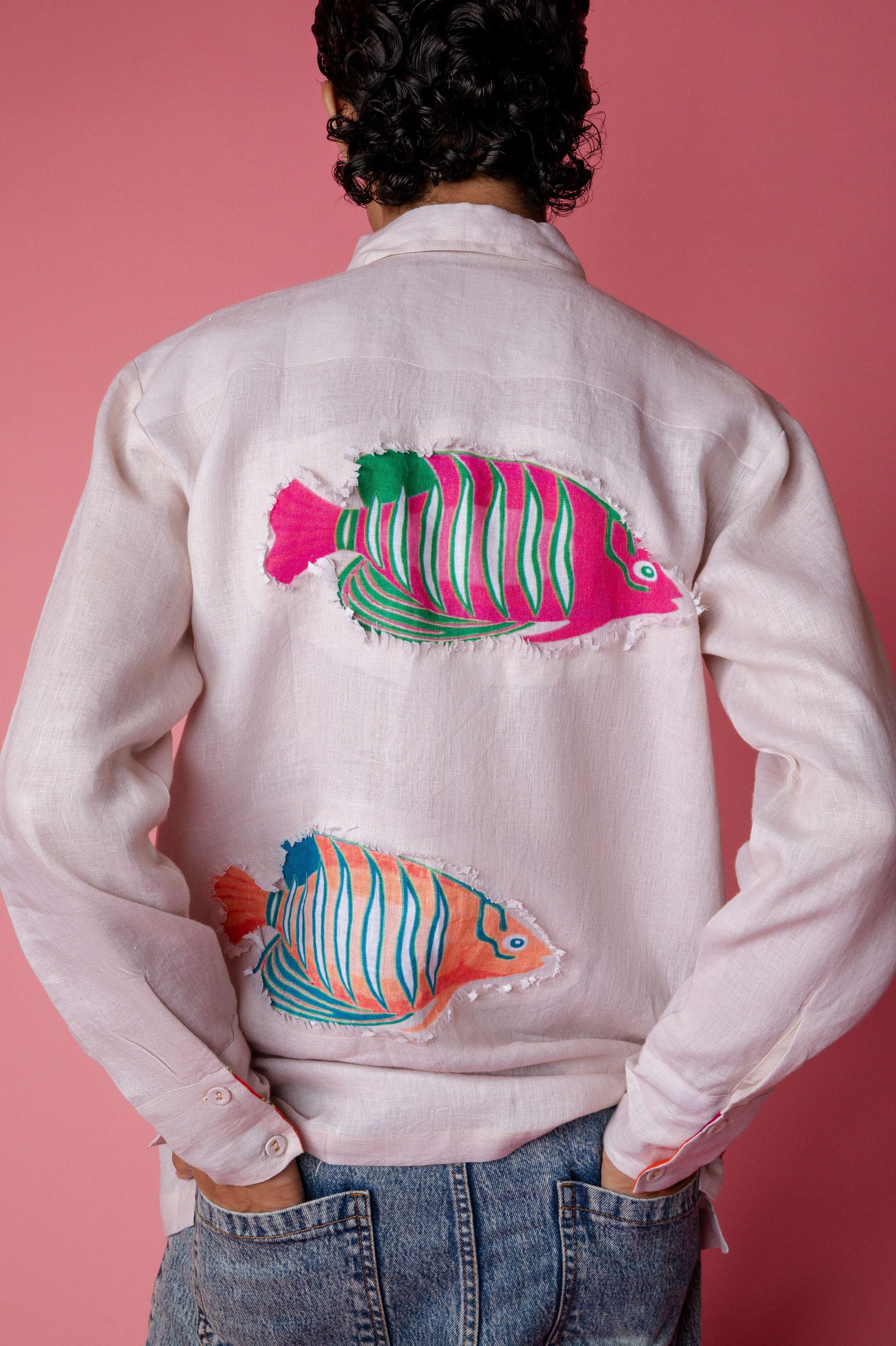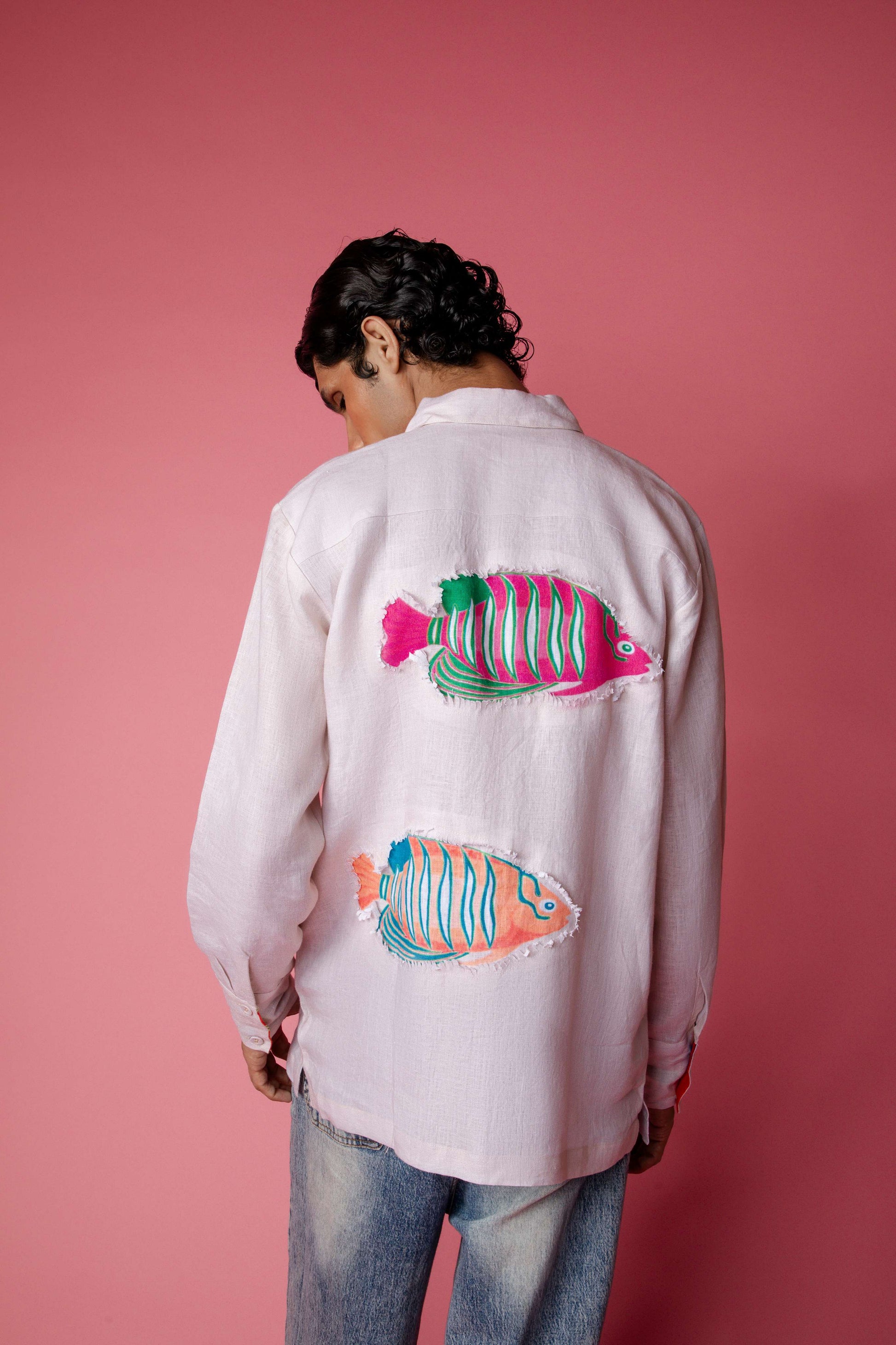 Clean in the front, statement in the back. This light beige full-sleeve linen shirt flips the script with a bold patchwork panel and distressed colorful fish patchwork. The inner placket and sleeve folds reveal flashes of the Tropical Swarm print, adding a playful twist. Collared, casual, oversized. This one’s stitched with personality for days when basic won’t cut it.